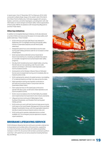 Other key initiatives In addition to its targeted blackspot initiatives, SLSQ also delivered a number of other services across the season to increase safety at all public waterways. These included: • SLSQ’s third annual Coast Safe Report was released in September 2017 to highlight drowning and aquatic safety trends on Queensland beaches and all inland public waterways; • Designated patrol hours were extended across the state during peak holiday periods to cater for an increased number of beachgoers; • SLSQ representatives attended various Queensland Government-led forums, including roundtable discussions on crocodile management and school-based water safety programs; • Etty Bay SLSC transitioned across to digital radios, ensuring that all clubs are now operating under the same radio network and linked in with SLSQ’s State Operations and Communications Centre; • Aerial patrols via the Westpac Lifesaver Rescue Helicopter Service were increased both during and immediately after extropical cyclone Linda; • SLSQ maintained its network of coastal cameras, now totalling 47, at selected beaches and high-risk areas across the state; • Night operations training was regularly conducted on the Gold and Sunshine Coasts in conjunction with the Queensland Water Police; • Dawn patrol services on the Gold Coast continued to operate 365 days a year, as did SLSQ’s State Operations and Communications Centre; • SLSQ’s recommendations from the Reef Safety Roundtable were implemented into Queensland’s dive industry standards; • Lifeguard services continued at Tallebudgera Creek, Southport Broadwater, and Paradise Point during peak holiday periods; • SLSQ continue to work with both local and state governments via its seat on the Local Disaster Management Group and State Disaster Coordination Group, with the organisation placed on standby to assist during ex-tropical cyclone Linda; and • SLSQ continued to operate a dedicated phone number, available 24/7, for emergency service agencies to request urgent assistance.