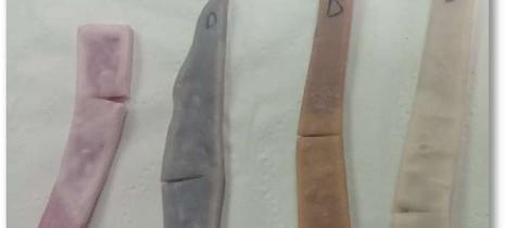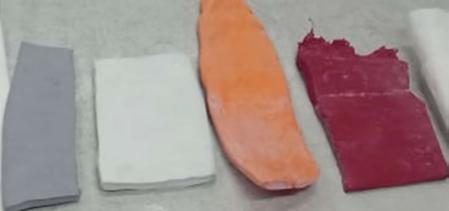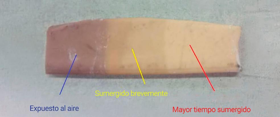 Una parte de esta muestra fue sumergida en agua, observándose el mismo cambio de coloración detectado en pruebas anteriores. Para ilustrar este fenómeno, se comparó la muestra alterada con el color original del material, tanto en su estado crudo como vulcanizado (figura 10).