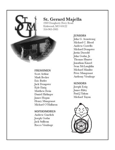 JUNIORS John G. Armstrong Michael C. Blood Andrew Costello Michael Dempster Justin Dussold John Godar, Jr. Thomas Hunter Jonathan Kinzel Sean McLaughlin Michael Mimlitz Peter Mungenast Anthony Vienhage SENIORS Joseph Essig James Riley Paul J.Tahan Michael Tayon