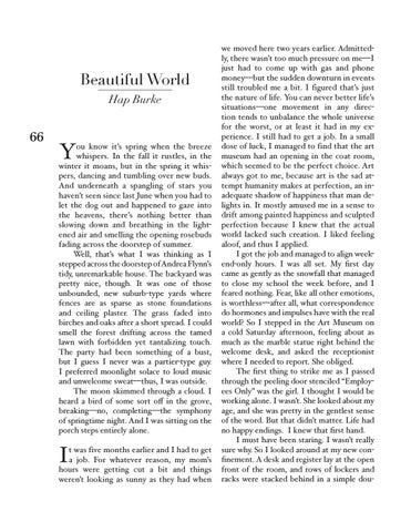 we moved here two years earlier. Admittedly, there wasn’t too much pressure on me—I just had to come up with gas and phone money—but the sudden downturn in events still troubled me a bit. I figured that’s just the nature of life. You can never better life’s situations—one movement in any direction tends to unbalance the whole universe for the worst, or at least it had in my experience. I still had to get a job. In a small dose of luck, I managed to find that the art museum had an opening in the coat room, which seemed to be the perfect choice. Art always got to me, because art is the sad attempt humanity makes at perfection, an inadequate shadow of happiness that man delights in. It mostly amused me in a sense to drift among painted happiness and sculpted perfection because I knew that the actual world lacked such creation. I liked feeling aloof, and thus I applied. I got the job and managed to align weekend-only hours. I was all set. My first day came as gently as the snowfall that managed to close my school the week before, and I feared nothing. Fear, like all other emotions, is worthless—after all, what correspondence do hormones and impulses have with the real world? So I stepped in the Art Museum on a cold Saturday afternoon, feeling about as much as the marble statue right behind the welcome desk, and asked the receptionist where I needed to report. She obliged. The first thing to strike me as I passed through the peeling door stenciled “Employees Only” was the girl. I thought I would be working alone. I wasn’t. She looked about my age, and she was pretty in the gentlest sense of the word. But that didn’t matter. Life had no happy endings. I knew that first hand. I must have been staring. I wasn’t really sure why. So I looked around at my new confinement. A desk and register lay at the open front of the room, and rows of lockers and racks were stacked behind in a simple dou-