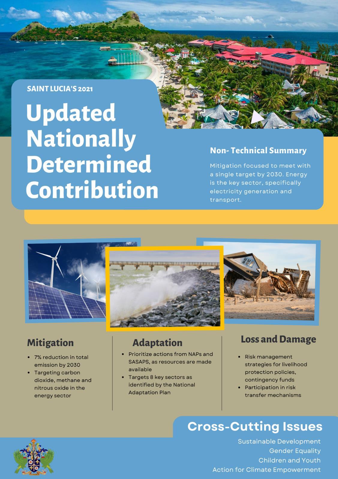 SaintLuciasubmitteditsIntendedNDCtoUNFCCCinNovember2015.InSeptember2019, Saint Lucia requested support from the NDC Partnership (NDCP) under its ClimateAction EnhancementPackage(CAEP)todevelopitsupdatedNationallyDeterminedContribution. This support was provided by the Organization of Eastern Caribbean States (OECS), the