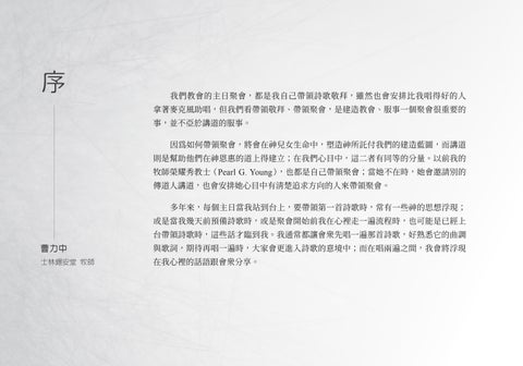 我們教會的主日聚會, 都是我自己帶領詩歌敬拜, 雖然也會安排比我唱得好的人 拿著麥克風助唱, 但我們看帶領敬拜、 帶領聚會, 是建造教會、 服事一個聚會很重要的 事,並不亞於講道的服事。 因為如何帶領聚會,將會在神兒女生命中,塑造神所託付我們的建造藍圖,而講道 則是幫助他們在神恩惠的道上得建立; 在我們心目中, 這二者有同等的分量。 以前我的 牧師榮耀秀教士( Pearl G. Young ),也都是自己帶領聚會;當她不在時,她會邀請別的 傳道人講道,也會安排她心目中有淸楚追求方向的人來帶領聚會。 多年來, 每 個主日當我站到台上, 要帶領第一首詩歌時, 常有一些神的思想浮現; 或是當我幾天前預備詩歌時, 或是聚會開始前我在心裡走一遍流程時, 也可能是已經上 台帶領詩歌時, 這些話才臨到我。 我通常都讓會眾先唱一遍那首詩歌, 好熟悉它的曲調 與歌詞, 期待再唱一遍時, 大家會更進入詩歌的意境中; 而在唱兩遍之間, 我會將浮現 在我心裡的話語跟會眾分享。 序 曹力中 士林錫安堂 牧師