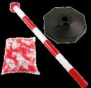 Inneholder 4 stk. stolper med føtter som fylles med vann eller sand for stødighet. Høyde 850mm. Leveres med 6,5 meter plastkjetting.