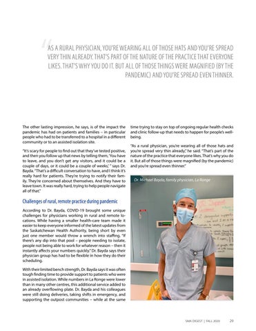 time trying to stay on top of ongoing regular health checks and clinic follow-up that needs to happen for people’s wellbeing. “As a rural physician, you’re wearing all of those hats and you’re spread very thin already,” he said. “That’s part of the nature of the practice that everyone likes. That’s why you do it. But all of those things were magnified (by the pandemic) and you’re spread even thinner.” Dr. Michael Bayda, family physician, La Ronge