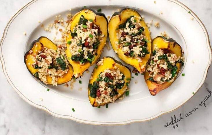 Add the sherry vinegar, stir, then add the kale and chopped sage. Cook until the kale wilts down, then add the cooked millet, pecans, cranberries and chives. Taste and adjust seasoning. Scoop the filling onto the roasted squash and serve.