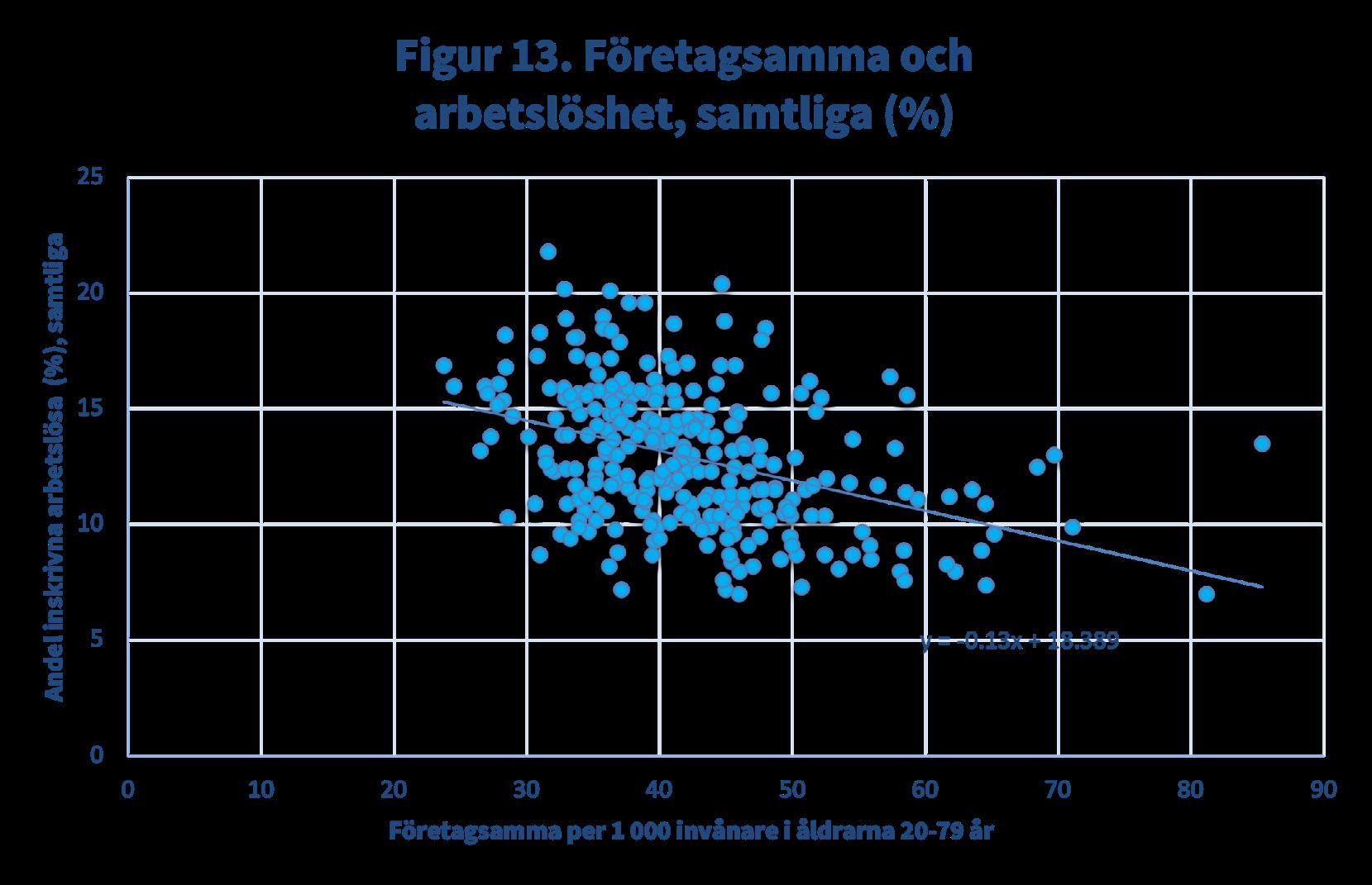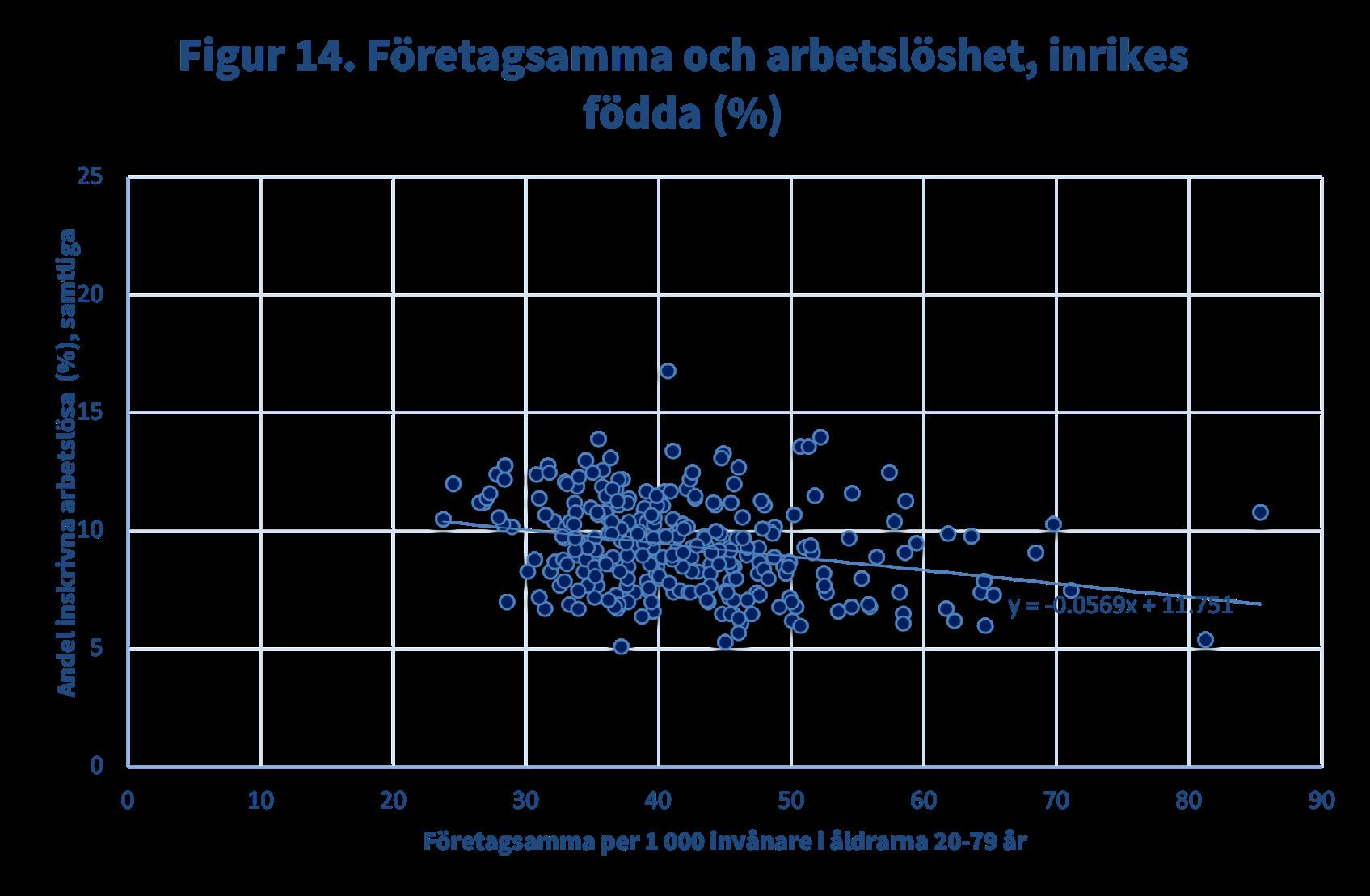 Eftersom små och medelstora företag är de främsta jobbskaparna i Sverige, skulle man kunna förvänta sig att såväl förvärvsfrekvensen som andelen arbetslösa är nära kopplad till koncentrationen av företagsamma. Detta är också vad data visar. I figur 13 visas sambandet mellan koncentrationen av företagsamma bland den vuxna befolkningen och andelen inskrivna arbetslösa för samtliga kommuner i landet. En procent högre nivå av företagsamma per capita, som andel av befolkningen i åldrarna 20–79 år, korrelerar mot knappt 1,3 procentenheter lägre andel arbetslösa. För de inrikes födda (figur 14) är varje procent högre andel företagsamma korrelerad till 0,6 procentenhet lägre andel arbetslösa.