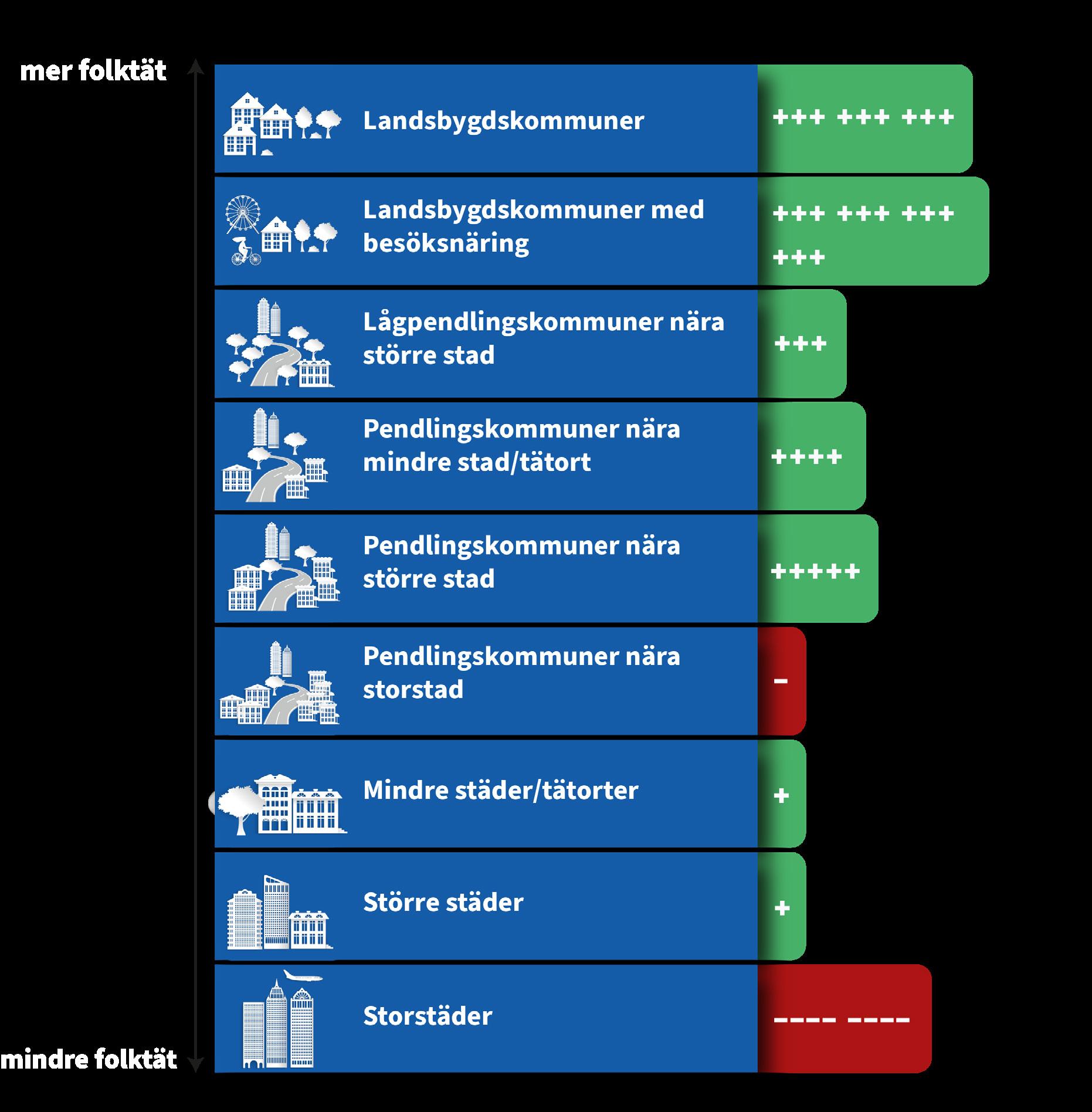 Skillnaderna är mycket påtagliga sett till företagsamhet bland storstäderna och deras kranskommuner. Det är också den del av Sverige där företagsamheten har stagnerat under senare tid, medan den typiskt ökar i de andra kommuntyperna i landet. Trygghet är en nödvändig förutsättning för ett välfungerande samhälle. Bättre trygghet behövs i hela Sverige, särskilt i storstäderna och en del av deras kranskommuner som har omfattande problem med kriminalitet. Otrygghet, höga kostnader och omfattande konkurrens skapar en situation där företagen i storstäderna och deras kranskommuner ofta har en låg överlevnadsgrad. Att få fart på företagsamheten i de mest folktäta kommunerna i Sverige fortsätter vara en viktig framtidsutmaning, då den trendmässiga utvecklingen är negativ.