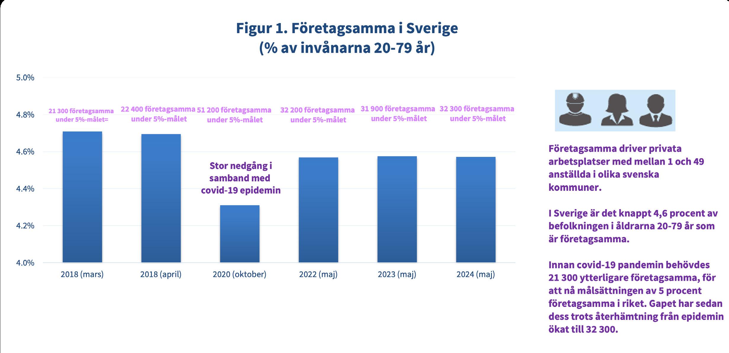 År 2024 finns det knappt 344 300 företagsamma, marginellt fler än 343 400 året innan. Som andel av den vuxna befolkningen skedde en marginell nedgång från 4,58 till 4,57 procent. Utvecklingen av företagsamma har varit marginellt svagare än befolkningstillväxten. Det saknas för närvarande 32 300 företagsamma för att Sverige ska nå målsättningen om att minst 5 procent av de vuxna ska driva aktiva arbetsplatser. Att nå upp till 5-procentsmålet är avgörande för att skapa en hållbar situation för den svenska arbetsmarknaden – det behövs fler jobbskapare för att sysselsättningen ska fungera väl.2