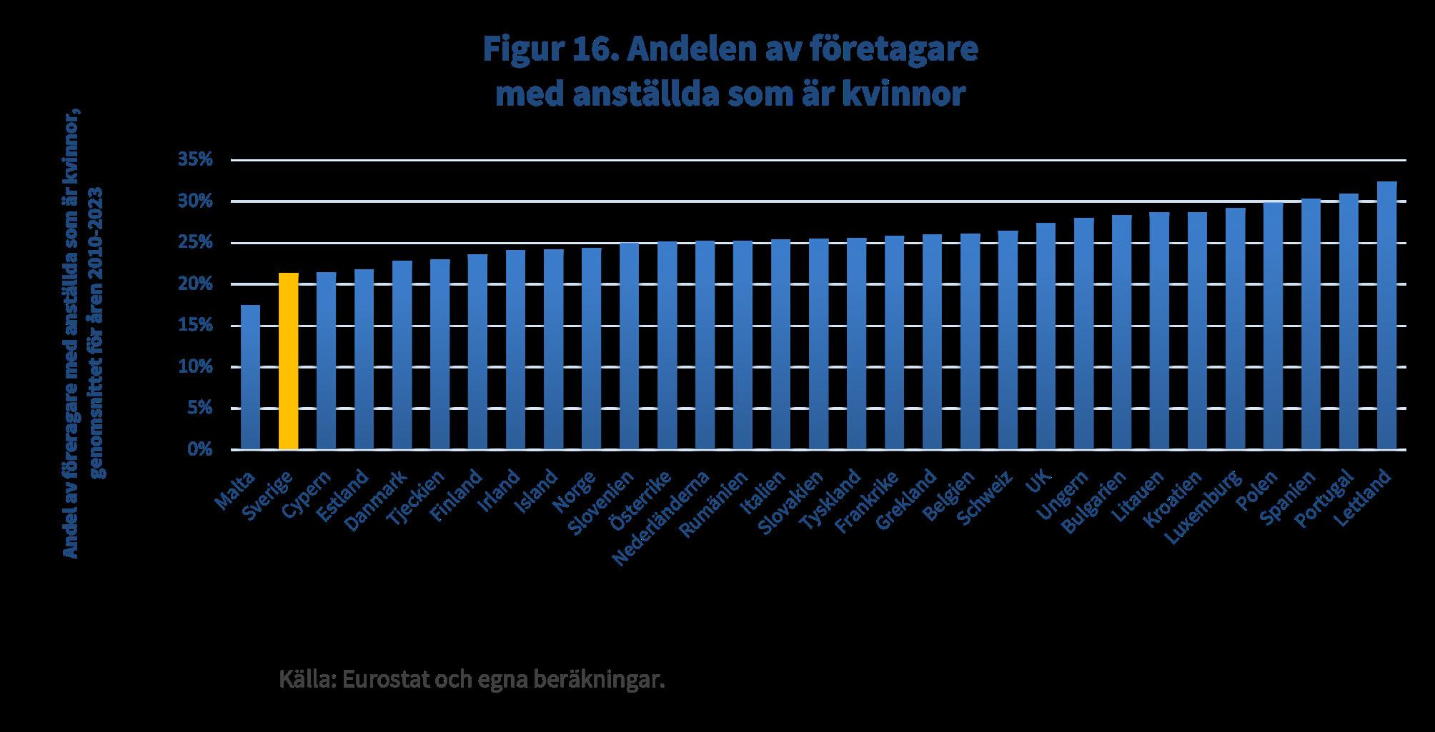 Ett särskilt intressant perspektiv gäller kvinnors företagande. I Sverige totalt är det enbart 21 procent av företagarna med anställda som är kvinnor. Detta är genomsnittliga siffror för åren 2010 till 2023, med data från Eurostat. Som visas i figur 16 har Sverige bland de lägsta andelarna av kvinnor som företagare i en jämförelse med EU:s medlemsstater. Enbart Malta har en lägre andel, medan nivån på Cypern är lika låg som i Sverige. Sverige, som har bland de mest jämställda värderingarna i världen, och dessutom relativt jämställd fördelning av hemarbete, misslyckas med kvinnors företagande. En bidragande orsak till denna snedfördelning är att Sveriges omfattande socialförsäkringssystem utformats så att systemen framför allt är anpassade för anställda, huvudsakligen inom offentlig sektor, snarare än för företagare.
