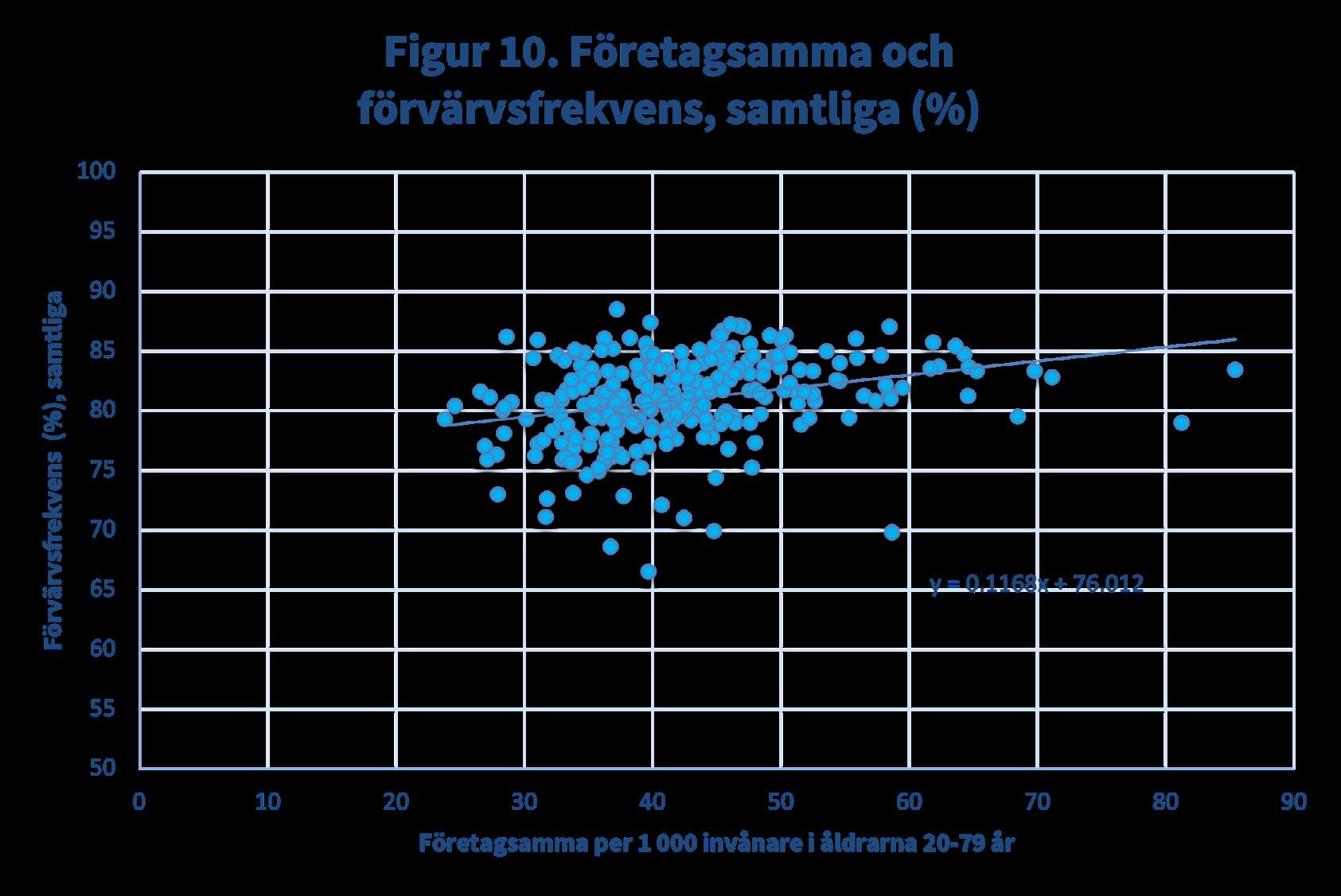 Det finns goda skäl att främja företagsamheten så att Sverige får fler företagsamma. Anledningen är att det finns ett tydligt och starkt samband mellan andel företagsamma och förvärvsfrekvensen i Sveriges kommuner. I figur 10 visas sambandet mellan dessa faktorer för samtliga kommuner i landet. Det generella mönstret är att kommuner med en högre andel företagsamma också har en högre förvärvsfrekvens. Sambandet visar att en procent högre nivå av företagsamma, som andel av befolkningen i åldrarna 20–79 år, är länkad till knappt 1,2 procent högre förvärvsfrekvens. Figur 11 och 12 illustrerar sambandet för inrikes födda respektive för utrikes födda. En procent högre andel företagsamma är korrelerad till drygt 0,7 procent högre förvärvsfrekvens bland inrikes födda, och inom gruppen utrikes födda till drygt 1,9 procent högre förvärvsfrekvens.