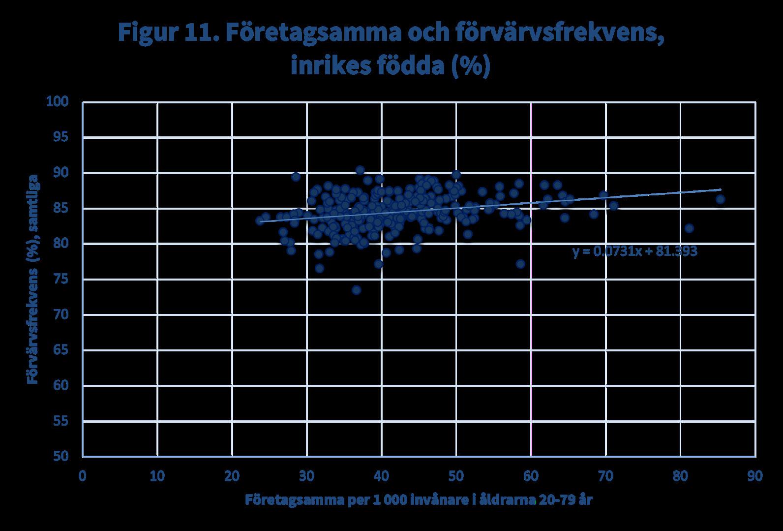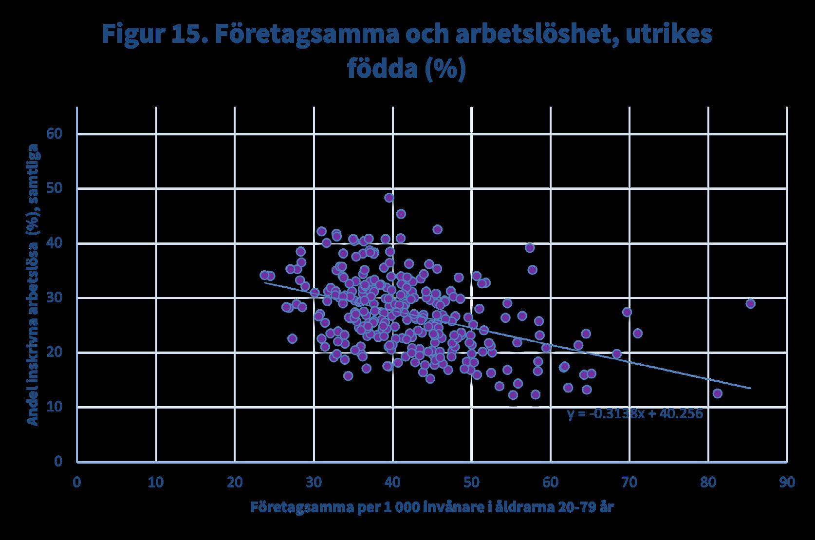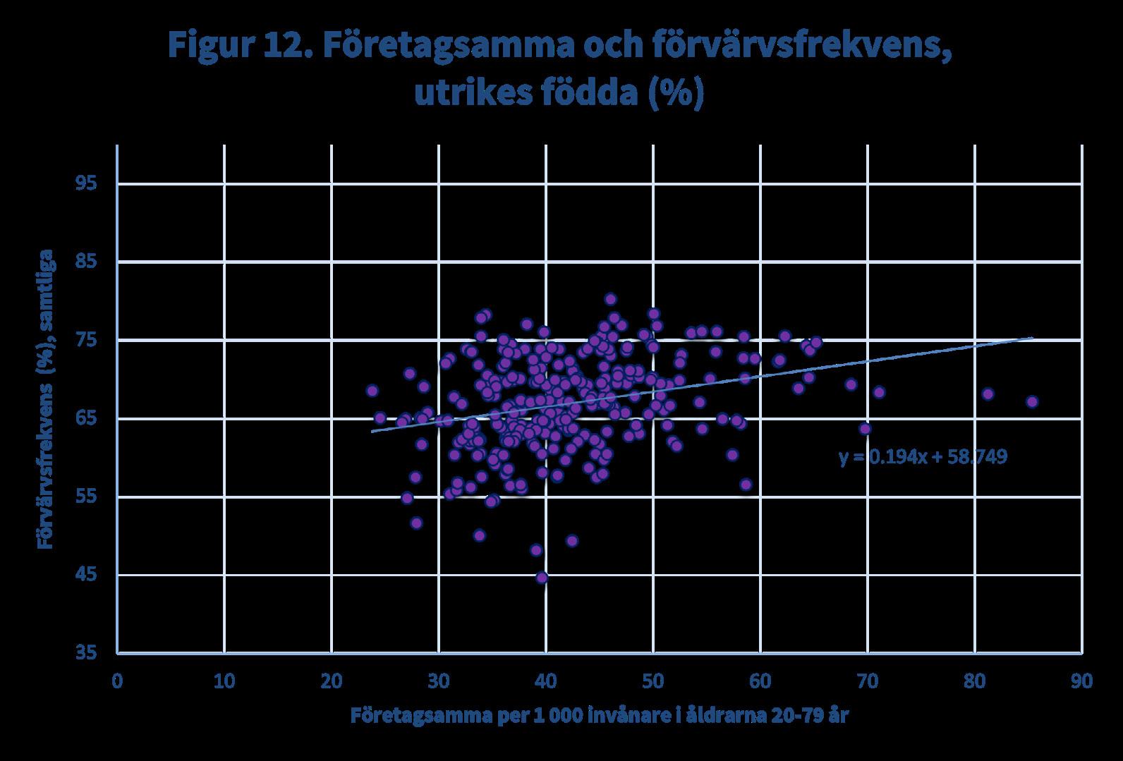 mönster att antal företagsamma, som andel av den vuxna befolkningen, samvarierar med andelen i arbete. Det är i synnerhet utrikes födda som gynnas av de möjligheter på arbetsmarknaden som företagsamma skapar. För samtliga på arbetsmarknaden är varje procent högre andel företagsamma korrelerad till knappt 1,2 procent högre andel förvärvsarbetande. Bland utrikes födda är sambandet ännu starkare, då varje procent högre andel företagsamma korrelerar till drygt 1,9 procent högre förvärvsfrekvens.