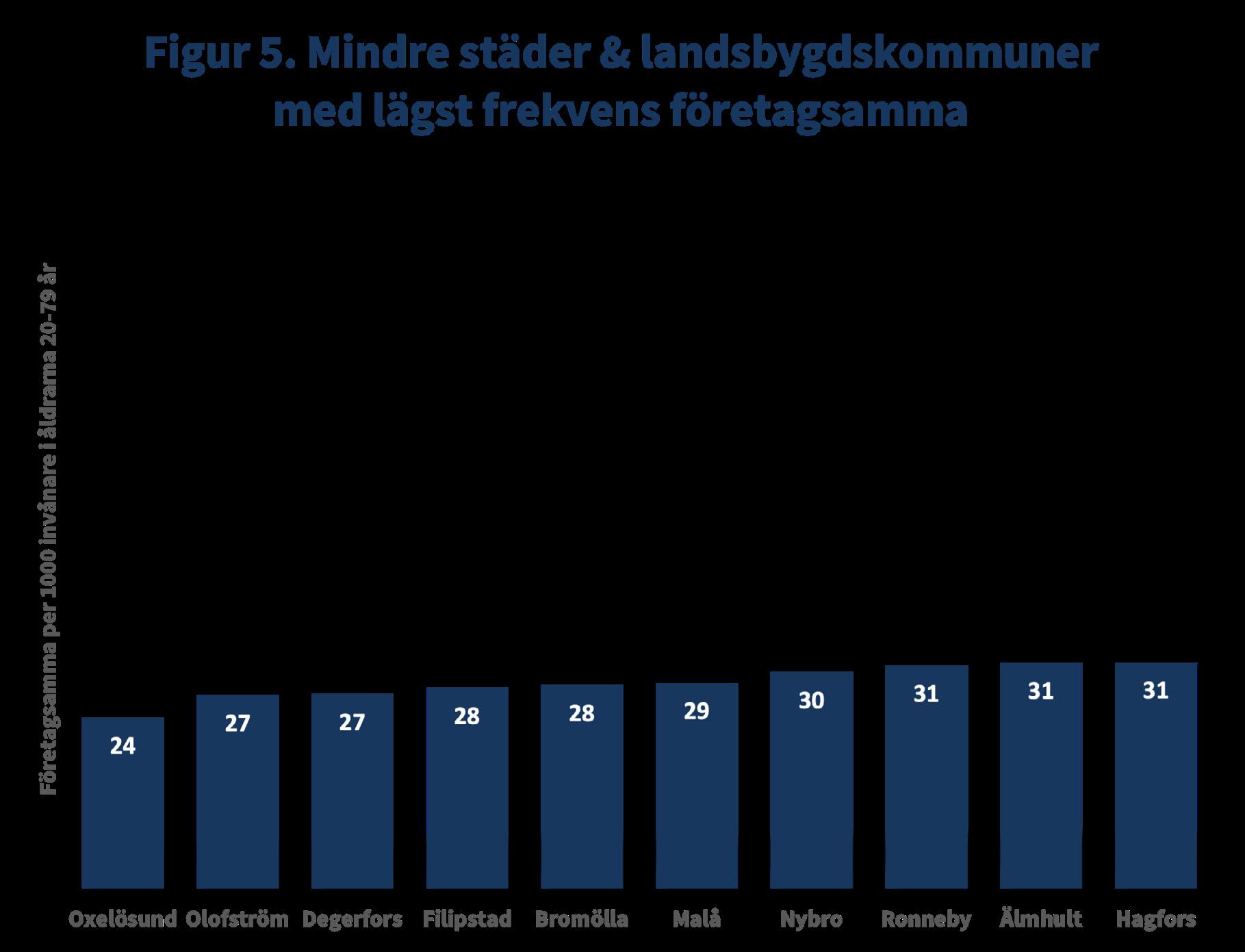 I figur 5 visas mindre befolkningstäta kommuner med lägst andel företagsamma. Skillnaden i koncentrationen av företagsamma är markant jämfört med kommunerna i figur 4, och vi ser ett tydligt mönster där turistkommunerna har en högre andel företagsamma medan traditionella bruksorter har få företagsamma per capita. Även en rad pendlingskommuner har en låg andel företagsamma. Kommunernas karaktär är således starkt kopplad till andelen företagsamma. Den lägsta nivån på företagsamhet per capita, bland gruppen samt även för hela Sverige, finns liksom förra året i Oxelösund. Därefter följer Forshaga, Surahammar, Munkfors, Sandviken, Hofors, Finspång, Vännäs, Bjuv och Hammarö. Det är anmärkningsvärt att i denna grupp återfinns flera kommuner med internationella högteknologiska företag. Även kommuner som har enskilda företag med internationellt genomslag kan stagnera, om de i övrigt saknar ett bra företagsklimat. Vad som krävs för att lyckas är ett starkt ekosystem av lokala företag, med många olika jobbskapare.
