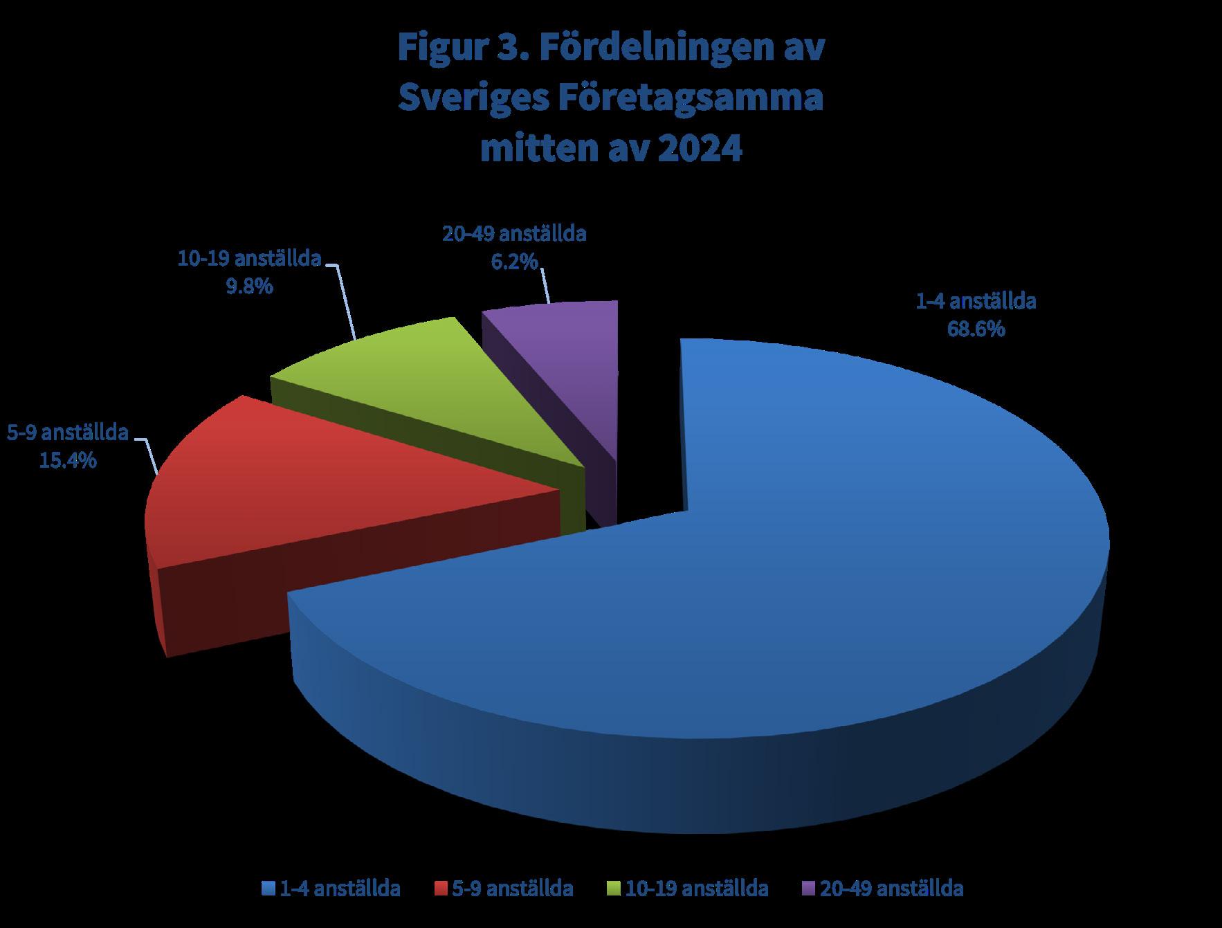 Som illustreras i figur 3 domineras företagsamma av småföretagare, då två tredjedelar har mellan en och fyra anställda. Bland resterande tredjedel har hälften färre än och hälften fler än tio anställda. Mellan sista maj 2023 och sista maj 2024 har små förändringar skett i storleksgrupperingen bland företagsamma. Andelen företagsamma med 1-4 anställda har ökat från 68,2 till 68,6 procent av helheten. Andelen med 5-9 anställda har minskat lite från 15,5 till 15,4 procent. Andelen med 10-19 anställda har minskat från 9,9 till 9,8 procent. Andelen med 20-49 anställda har minskat något från 6,3 till 6,2 procent. De mindre företagen har blivit något vanligare.