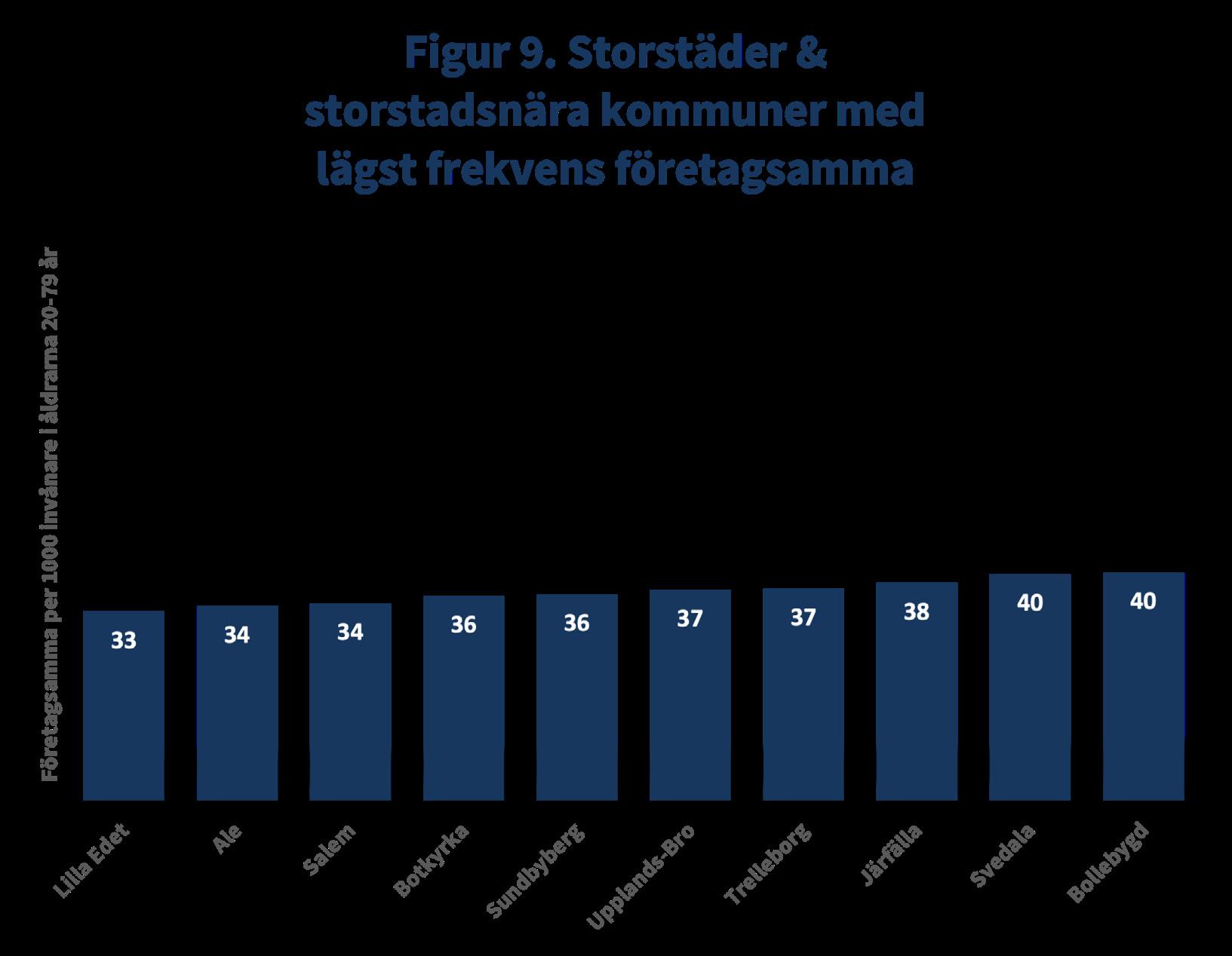 Andelen företagsamma är 4,6 procent i Göteborg och 4,5 i Malmö. I Sveriges näst största och tredje största stad finns alltså en uppenbar brist på företagsamma, trots att dessa är högskolestäder, är hemvist för världsledande företag och med hamnar och omfattande handel med omvärlden samt en köpstark lokal marknad. Malmö har dessutom fördelen av att vara nära integrerad med Danmarks huvudstad Köpenhamn. I figur 9 visas de tio kommunerna i gruppen som har lägst andel företagsamma. Det är Lilla Edet, Ale, Salem,
