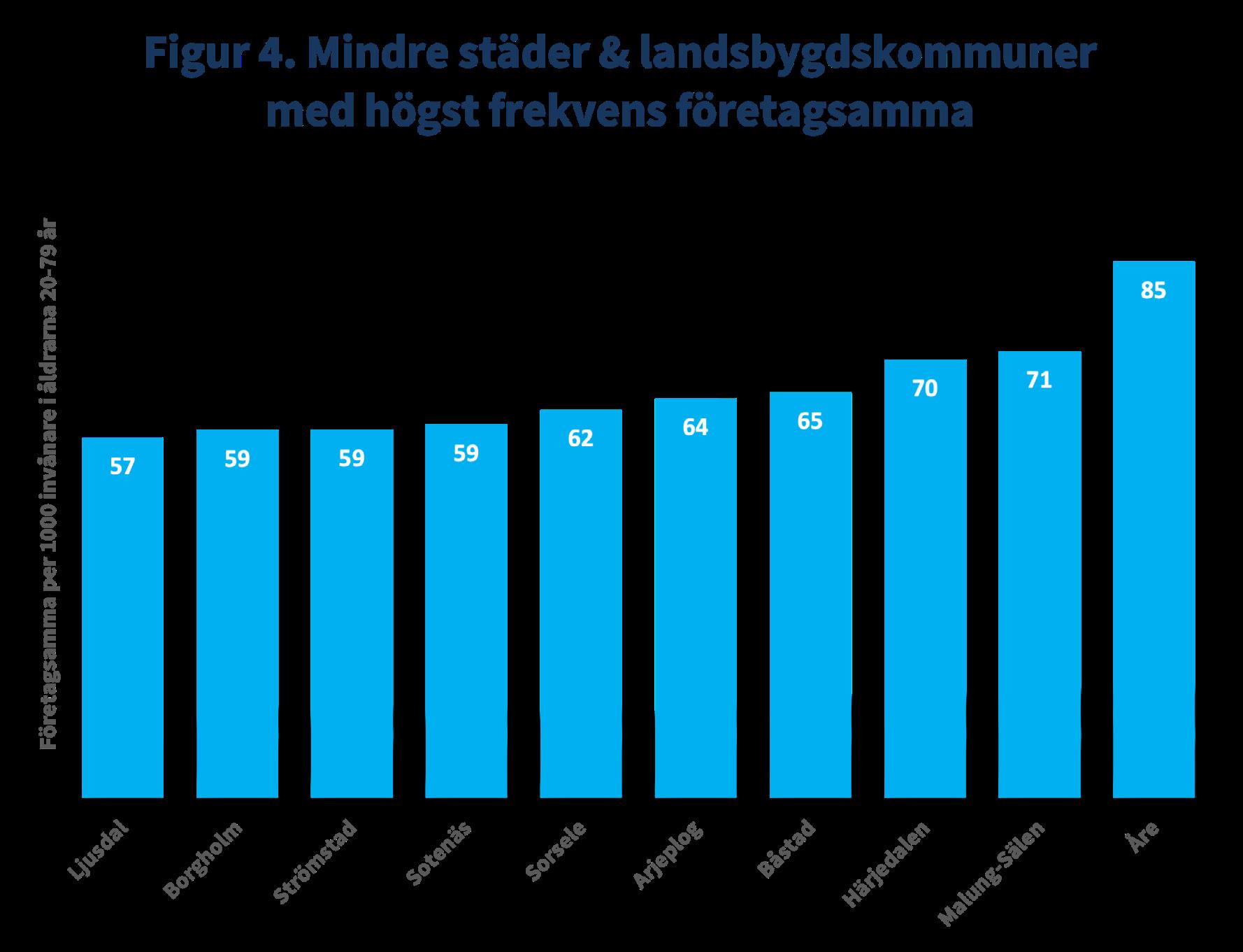 Det finns 136 kommuner i kategorin mindre städer och landsbygd. Något förenklat finns större utmaningar på arbetsmarknaden i de mindre befolkningstäta kommunerna av landet, jämfört med i de mera folktäta. Undantaget är landsbygdskommuner med turismsektor –turismen bidrar till så många arbetstillfällen att dessa kommuner klarar sig ovanligt väl. Ytterligare undantag utgörs av utanförskapsområden i de större städerna, som trots att de är folktäta har utmaningar med låg utbildningsnivå och otrygghet. I figur 4 visas mindre städer och landsbygdskommuner med högst frekvens av företagsamma.4 På första plats finns Åre, där 8,5 procent av befolkningen i åldrarna 20 till 79 år är företagsamma, följt av Malung-Sälen där nivån är 7,1 procent. Det är samma kommuner som även tidigare har varit på topp inom denna kommungrupp. Tack vare turismen ligger de i topp även nationellt.