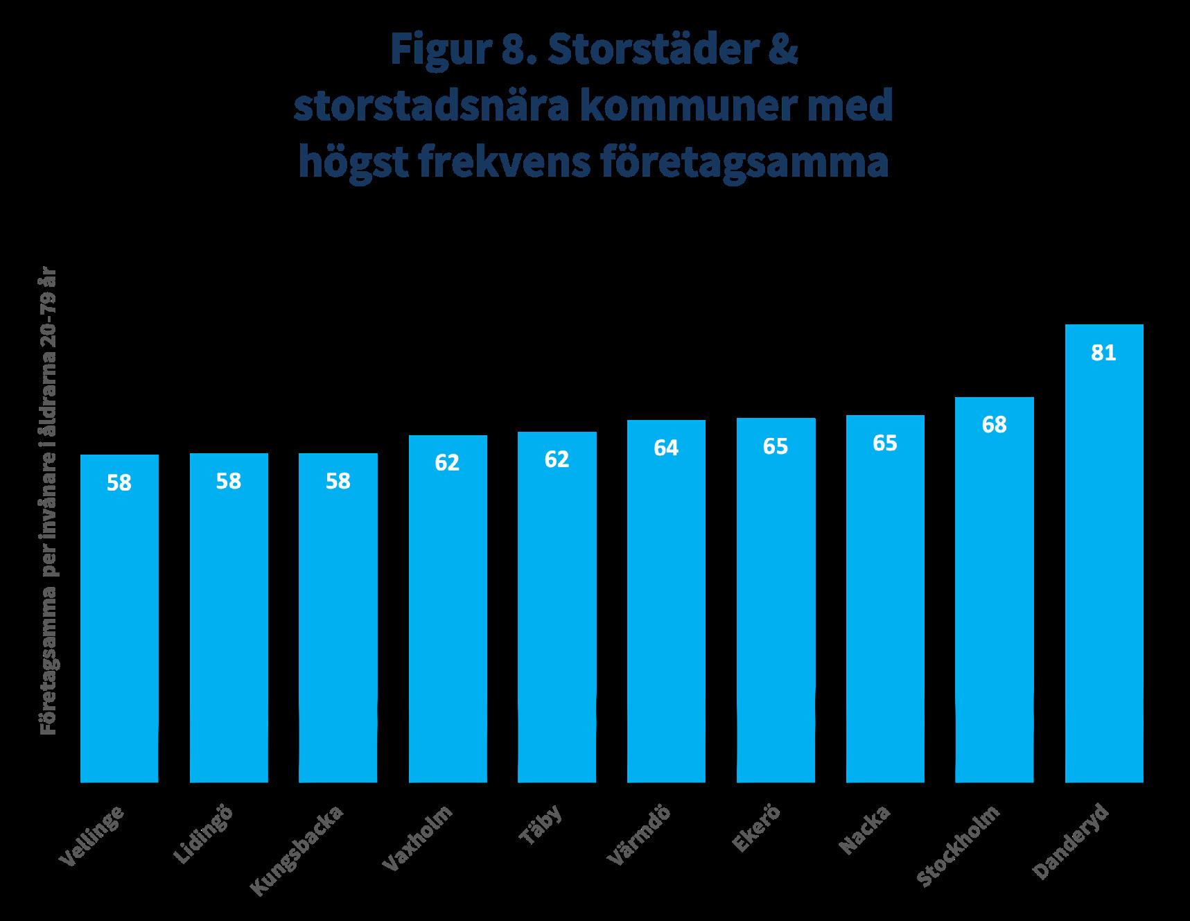 Storstadskommuner och storstadsnära kommuner i Sverige utgörs av Stockholm, Göteborg, Malmö samt kommunerna runt dessa städer. Sammanlagt finns 46 kommuner i denna grupp. I figur 8 visas de tio kommuner i gruppen som har högst andel företagsamma.6 I topp hamnar Danderyd, där 8,1 procent av personer i åldrarna 20–79 år är företagsamma, följt av huvudstadskommunen Stockholm där nivån är 6,8 procent. På nationell nivå är Danderyd den kommun som har näst högst andel företagsamma, efter Åre, medan Stockholm halkar ned från tredje till femte plats. Även Nacka, Ekerö, Värmdö, Täby, Vaxholm, Kungsbacka, Lidingö och Vellinge finns bland topp-10 gruppen.