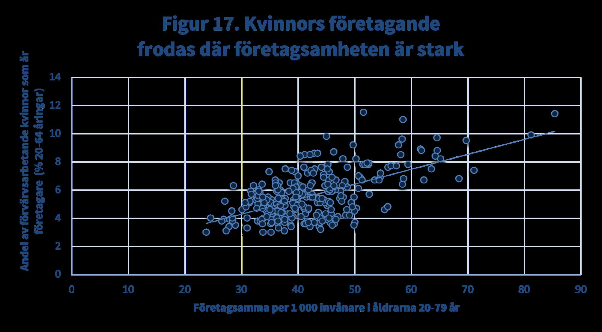 Hur är då sambanden inom Sverige? I figur 17 visas en jämförelse mellan å ena sidan andelen företagsamma per tusen vuxna, och å andra sidan andelen av de förvärvsarbetande kvinnorna som är företagare. Sambandet är starkt och tydligt. Det är betydligt vanligare att kvinnor i Sverige är företagare i de kommuner där den generella nivån av företagsamhet är högre. Att främja en högre generell nivå av företagsamhet kan därmed vara en strategi för att stärka kvinnors företagande. Ett lyft för kvinnors företagande behövs i en tid då jämställda Sverige släpar efter övriga Europa sett till kvinnors företagande. Det finns en rad ekonomiska reformer, till exempel socialförsäkringar mer anpassade till företagares villkor eller mer marknadskonkurrens i välfärden, som kan bidra till ett lyft för kvinnors företagande.