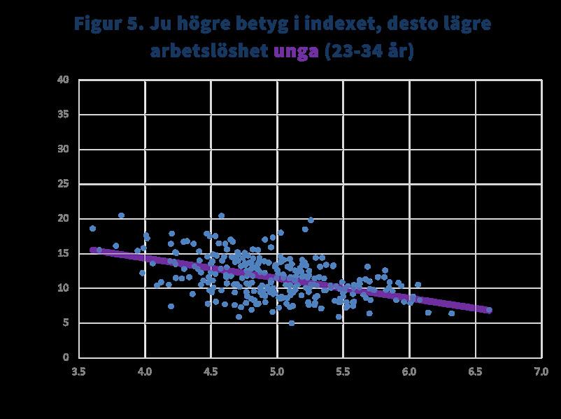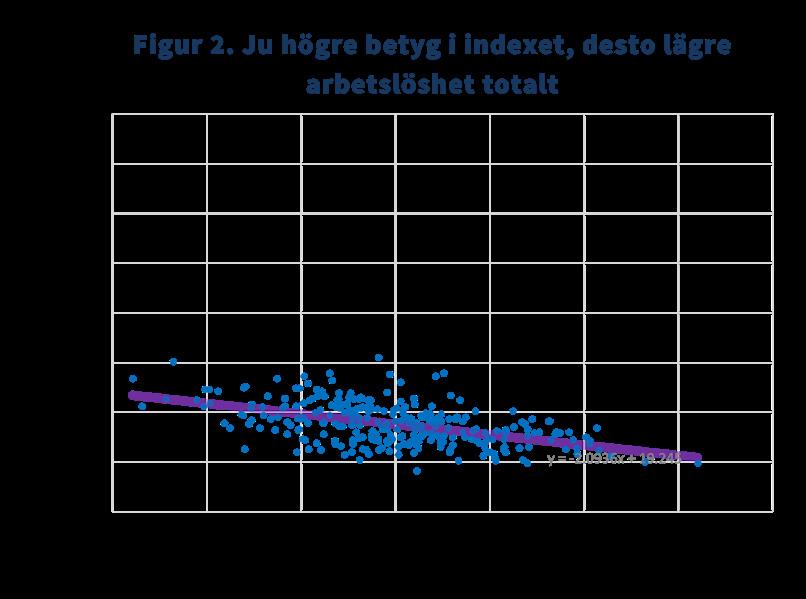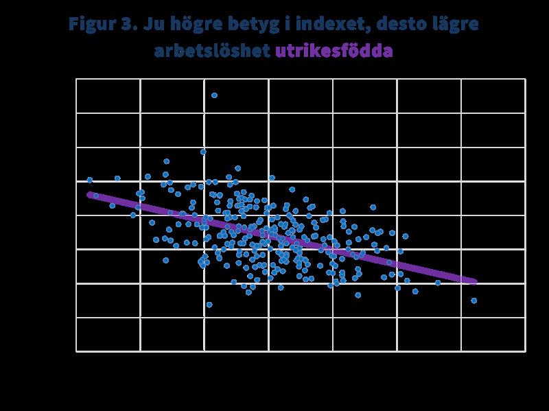 • De 50 kommuner som har högst betyg i SmåföretagarIndex har 6,1 procentenheter lägre öppen arbetslöshet i genomsnitt bland utrikes födda, än de 50 kommuner som har lägst betyg. För inrikes födda är skillnaden 1,9 procent lägre arbetslöshet. Resultaten i indexet är därmed tydligt länkade till utfallen på arbetsmarknaden.