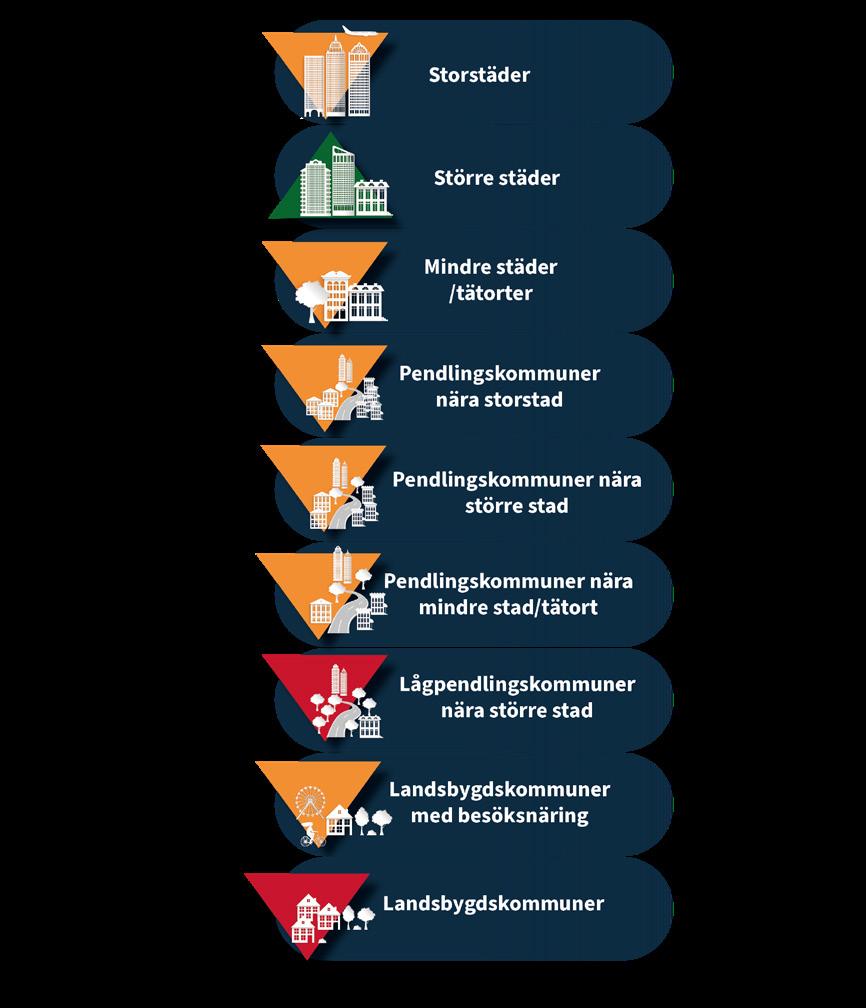 Sju av kommunerna på topp-10 listan är pendlingskommuner nära storstad, en är en mindre stad, en är pendlingskommun nära mindre stad och en är långpendlingskommun nära större stad.