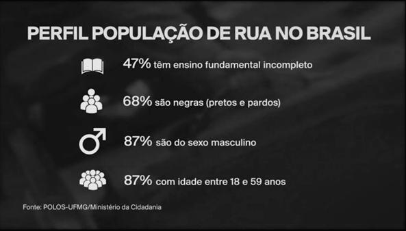A população em situação de rua, no Brasil, aumentou principalmente em consequência do período de pandemia. Em 2019, eram 174.766 pessoas em situação de rua no país. Em setembro de 2022, o número saltou para 213.371, e ainda pode ser subnotificado de acordo com especialistas. Segundo o levantamento da POLOS-UFMG, 68% dessa população é negra.