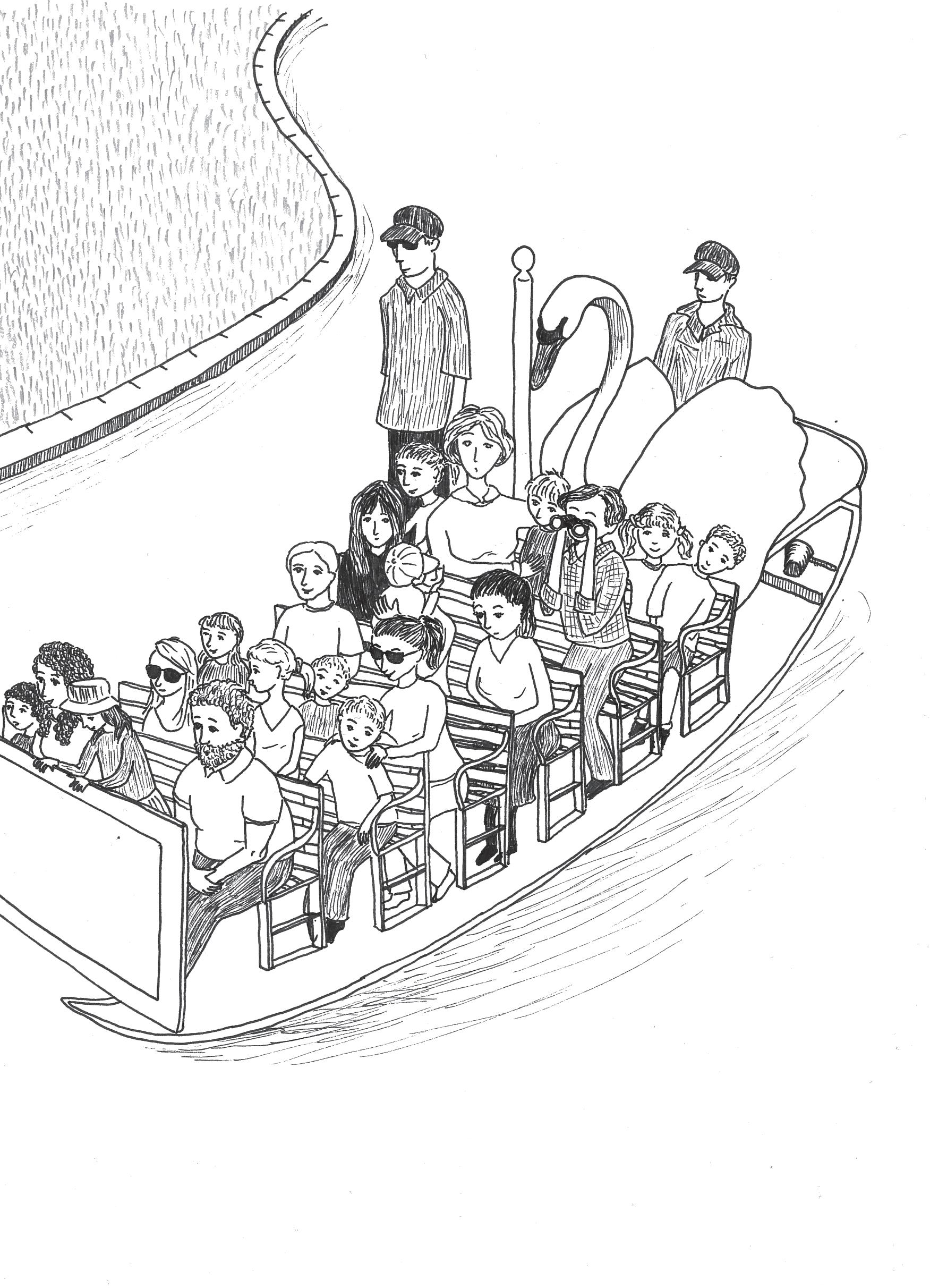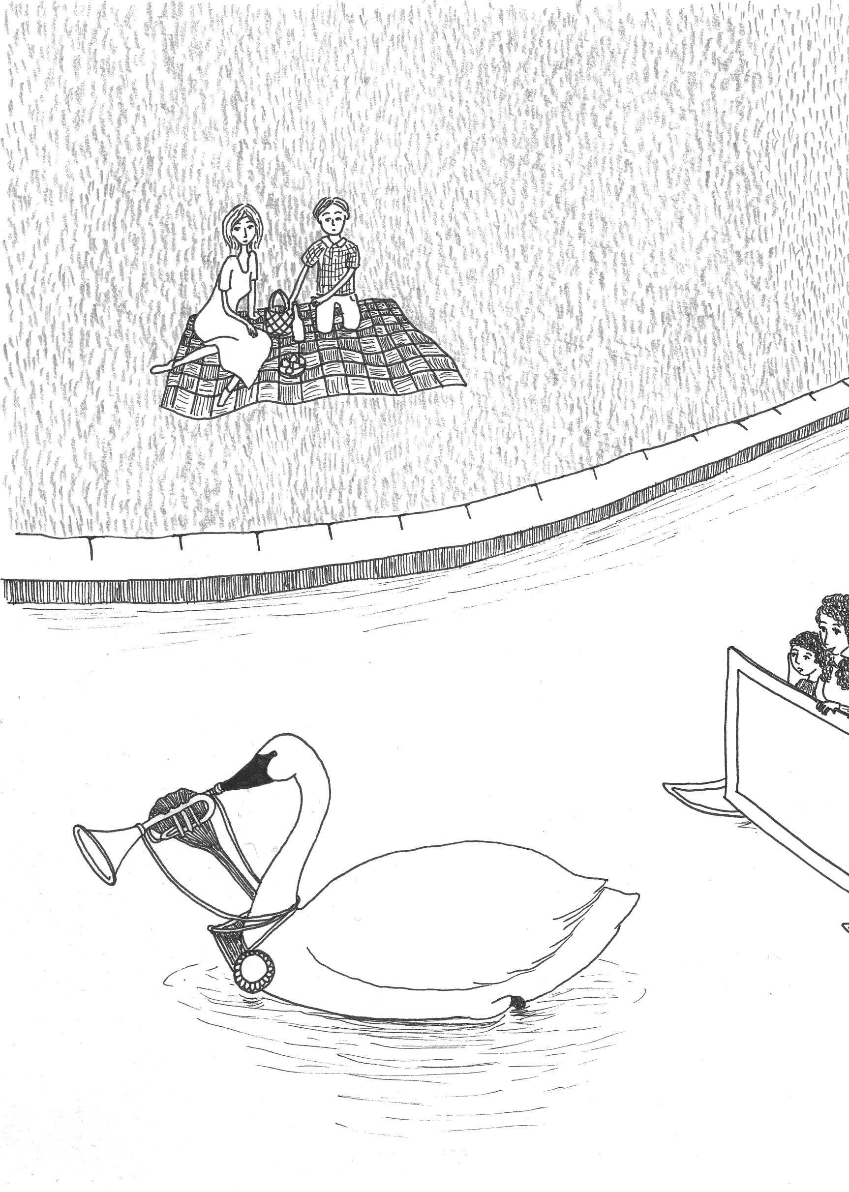 två enorma svanar. De var så mycket större än någon fågel han någonsin hade sett förut. Boet var mycket större också – en hög av stickor och gräs. Honan låg på äggen; hannen gled långsamt fram och tillbaka och vakade över henne.