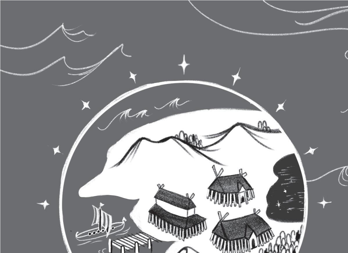 Saga stomped through the snow towards the harbour. She found the little longboat that her afi had made her on her last birthday, and climbed inside. Silvery fish slipped in and out of the ripples like fallen stars. A ring of mountains cradled the fjord, their steep walls of rock coated with snow. Here and there, an eagle cried out in the distance and the air was thick with salt. Saga propped her chin up on her arms as she watched the lantern-lit morning boats glide out of the harbour and into deeper, colder water, where the secret doorway through the magical shield lay. When they returned, the fisherfolk’s eyelashes would be frozen and their nets heaving with fish. Behind her, the wooden buildings of the village