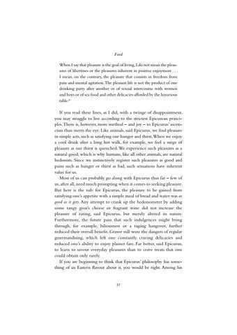 Food When I say that pleasure is the goal of living, I do not mean the pleasures of libertines or the pleasures inherent in positive enjoyment . . . I mean, on the contrary, the pleasure that consists in freedom from pain and mental agitation. The pleasant life is not the product of one drinking party after another or of sexual intercourse with women and boys or of sea food and other delicacies afforded by the luxurious table.41