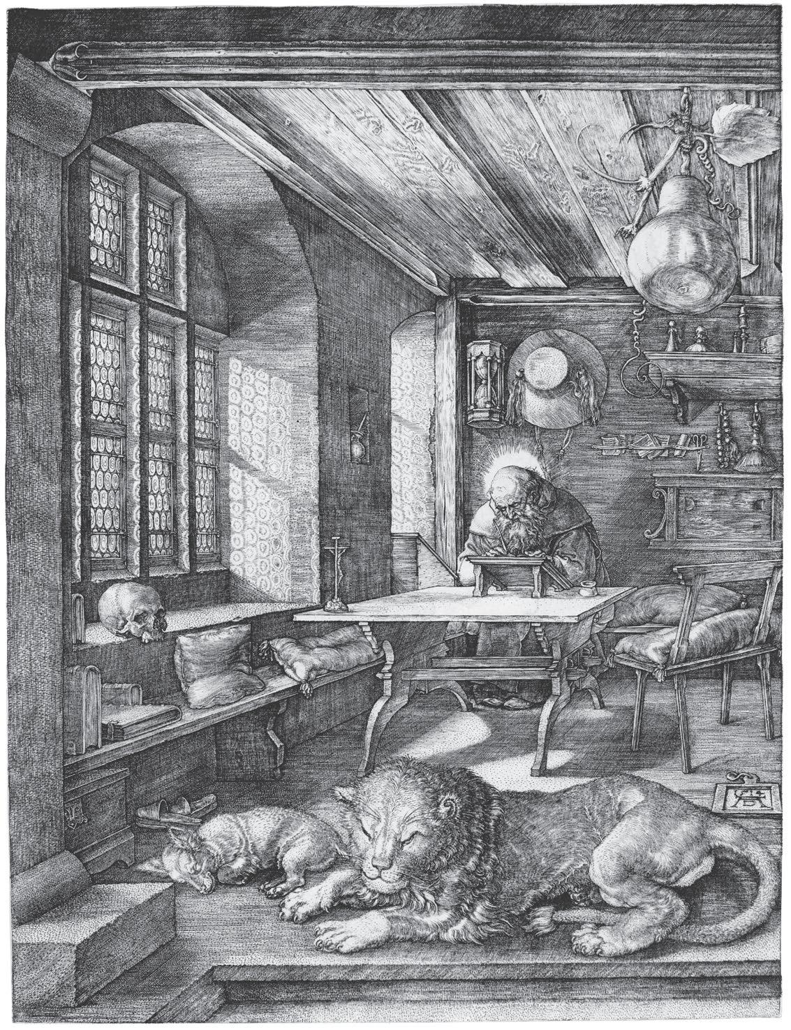 I have a fi ne copy of an engraving by the sixteenthcentury German artist Albrecht Dürer on the wall of my study, which I inherited from my mother. It shows St Jerome at his desk in his study, a beautiful medieval room with a co ered ceiling and a large window with deep reveals and small panes of crown glass, through which diagonal sunlight falls. There is a lion – the creature associated with the saint – sleeping on the floor in front of him. The story goes that he removed a thorn from its paw, and it became a sort of pet. Next to the lion is a dog, symbolising loyalty. St Jerome was one of the early fathers of the Christian Church. He is said to have had an enthusiastic following of wealthy widows in fifth- century Rome. One of their daughters came under