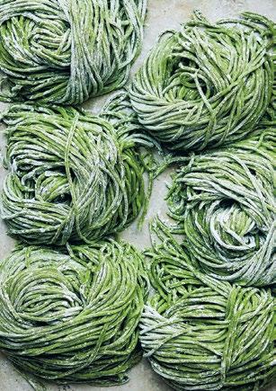 Pastadeg ska vara fast och mjuk på samma gång. Jag gör bolognavarianten som du antingen kan kavla ut för hand eller köra i maskin. Degen behöver inte pudras med durumvete. Jag blandar i både örter och spenat för att få den riktigt grön.
