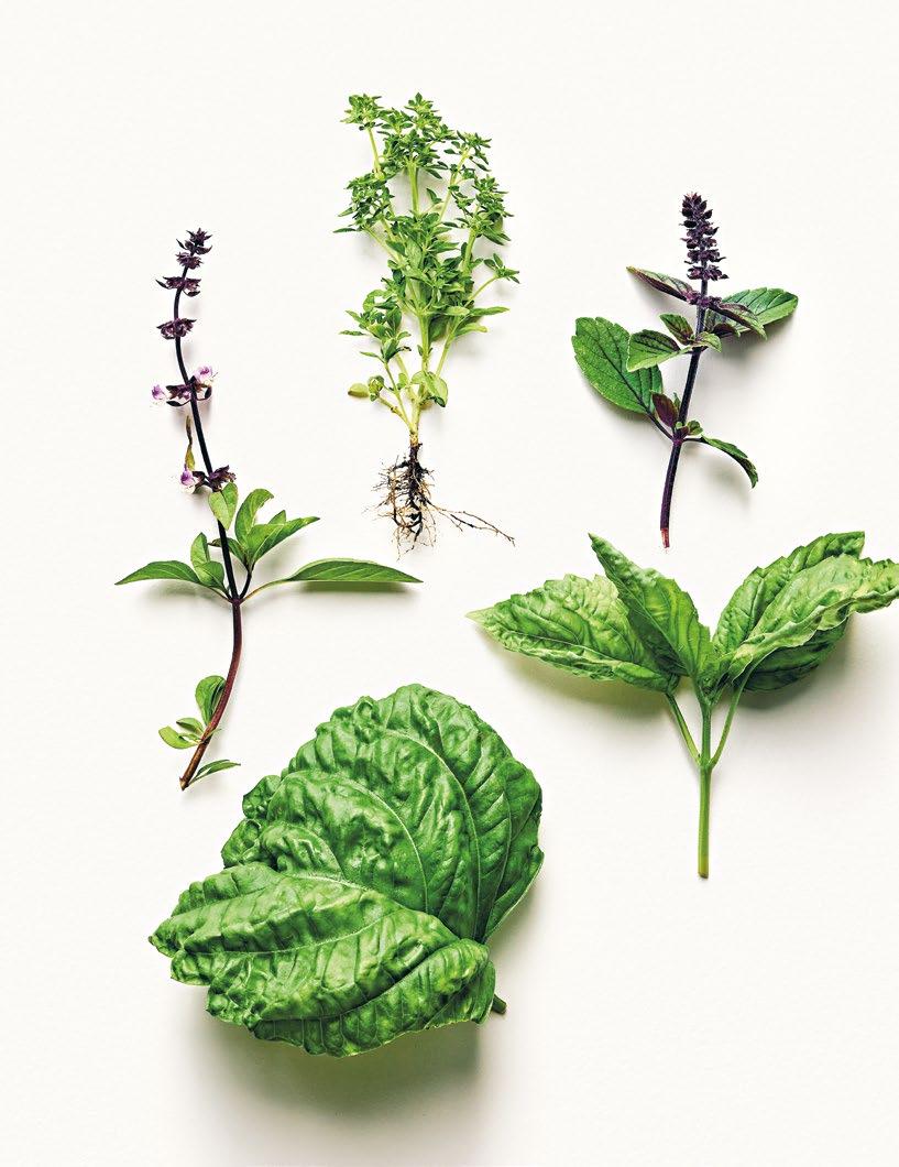 Basilika är extremt användbar och jag odlar minst sex sorter varje säsong för att få variation i både färg och smak. Favoriterna är ’Genovese’, röd basilika ’Rosso’, purpurbasilika ’Deep Purple’, thaibasilika ’Thai Magic’, citronbasilika, salladsbasilika ’Mammoth’ med sina extremt stora blad, grekisk basilika ’Greco a Palla’ med sina pyttesmå blad och sin gulliga buskform som blir som ett litet klot. Nästa säsong ska jag ge mig på dvärgbasilika, som har små blad och otroligt kraftfull smak.