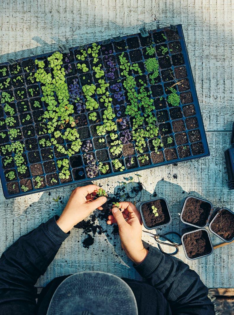 Det finns två sätt att odla basilika på. Det ena är att ta sticklingar av plantor och rota dem i vatten eller direkt i jord. Det andra är att så frön, och det är roligast för då kan du frossa i olika sorter. Jag sår i pluggbrätten och planterar sen om i större krukor – jag vill ha basilika tidigt och förkultiverar inom