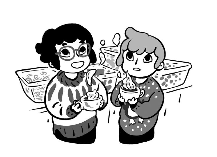 trots att det bara är eftermiddag. Många har tagit en paus och sitter med något varmt att dricka. I högtalarna spelas julmusik och allt är precis så där bra som Sam och Sara tycker att julen ska vara.