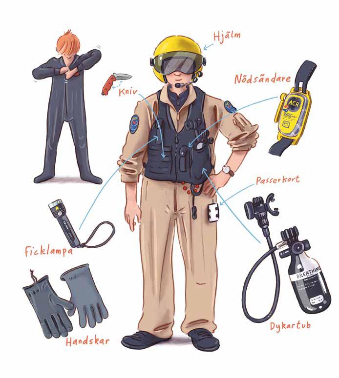 En brandpilot behöver massor med skyddsutrustning. Närmast kroppen har Halvan en isoleringsdräkt. Den håller honom varm om han skulle hamna i kallt vatten. Över den drar han på sig en brandsäker overall och en flytväst. Han tar också med sig: