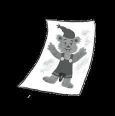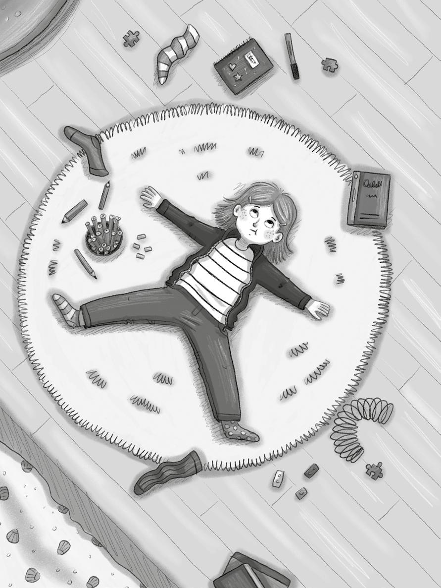 Jag ligger på mattan i mitt rum. Bredvid mig, längst ner i bokhyllan, har jag en plåtburk med tuschpennor och tuggummin. Jag stoppar in fem stycken i munnen samtidigt. Tuggummin alltså. Och låtsas att jag är en sjöstjärna. När man låtsas det spretar man med armarna och benen. Och så har man inga öron. För det har inte sjöstjärnor.