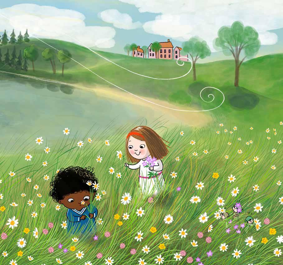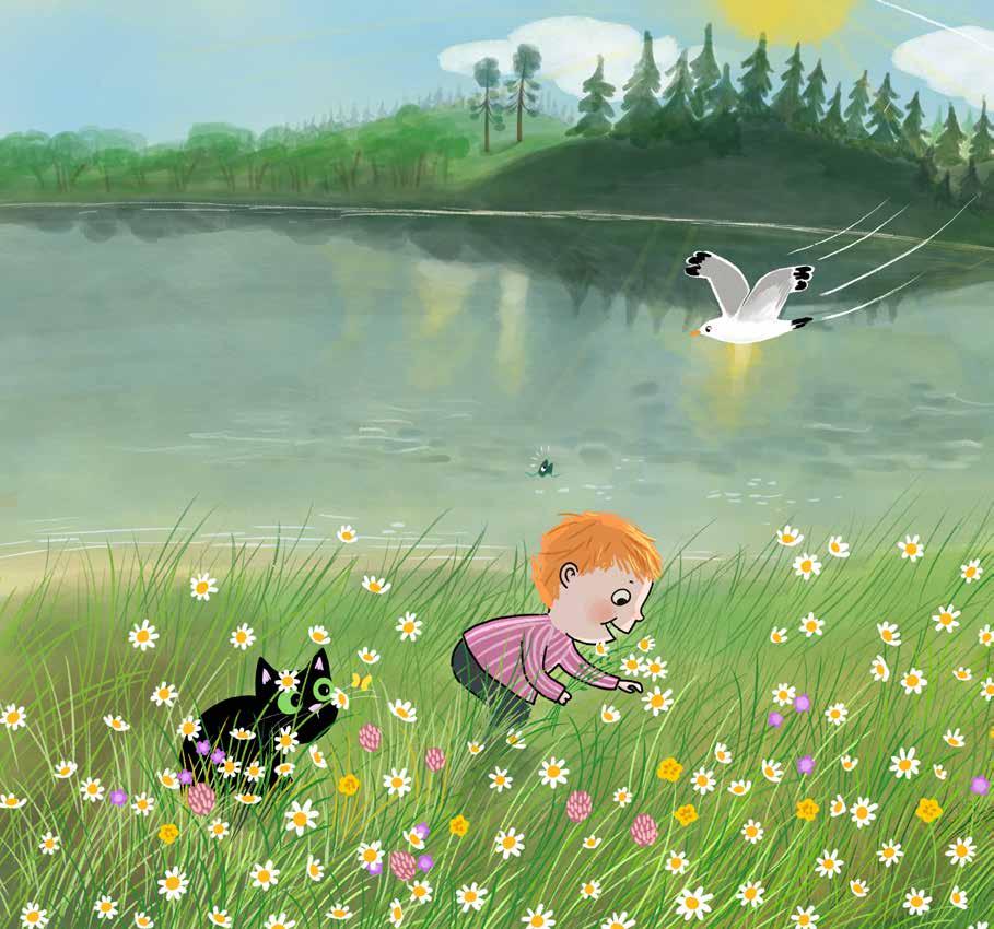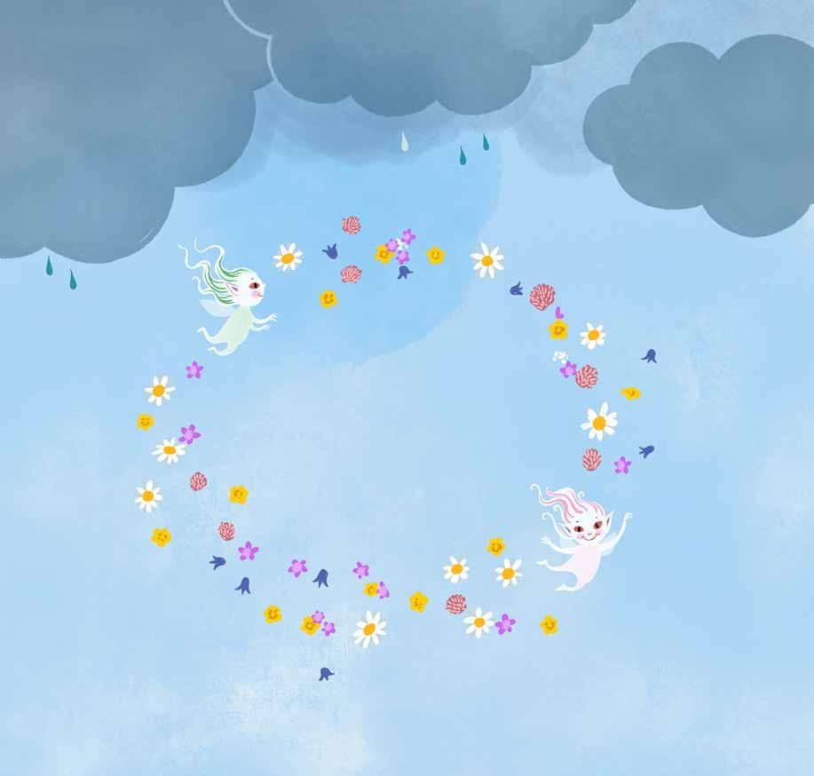 Plockar blommor, blad och kvistar, fågeln fiskar, vinden viskar.