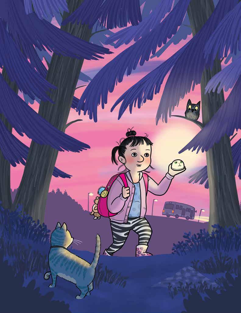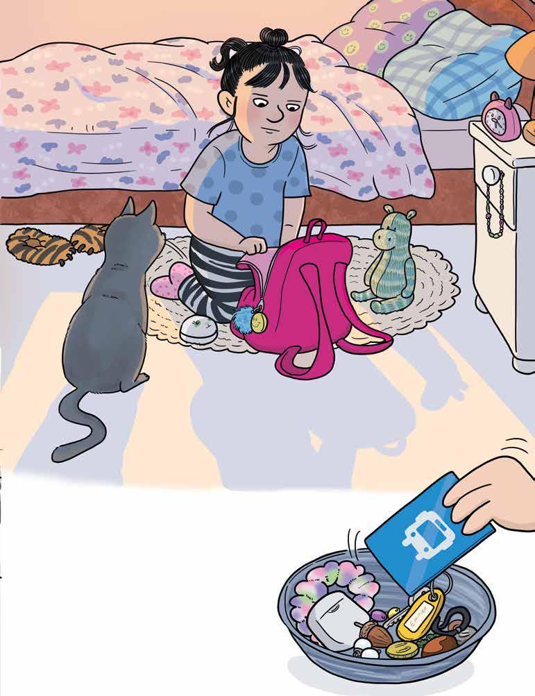 Idde drar fram ryggsäcken som ligger under sängen. Nu gäller det att vara snabb. Hon stoppar ner pyjamas, gosedjur, tandborste och en nattlampa i väskan. Sen går hon ut i hallen. Ur skålen på byrån tar hon mammas åkkort, och extranycklarna. Sen tar hon på sig jacka och skor.