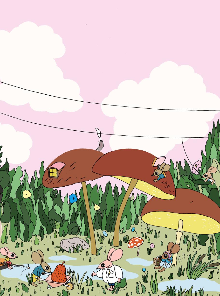 NÄSTA STOPP ÄR HOS AIKOS KUSINER, SKOGSMÖSSEN. DOM BOR I EN STÖVEL MITT BLAND MASSA SVAMPAR.