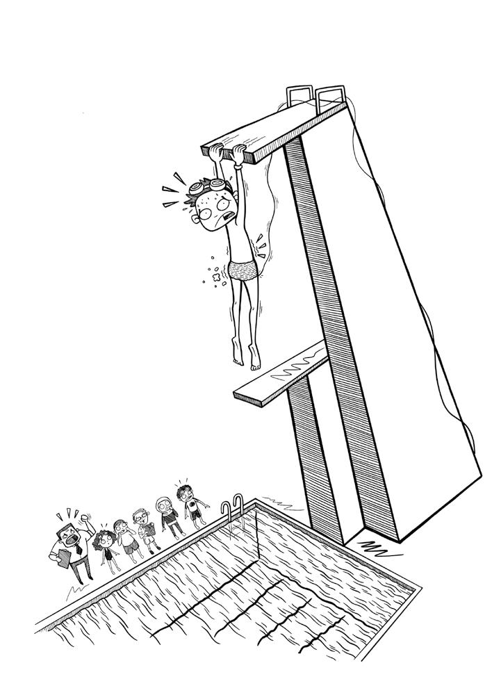 Justin hänger nu från ett tio meter högt hopptorn inför hela klassen, endast iklädd ett par hemvirkade badbyxor som sakta men säkert håller på att repas upp ...