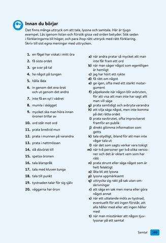 Innan du börjar Det finns många uttryck om att tala, lyssna och samtala. Här är tjugo exempel. Läs igenom listan och försök gissa vad orden betyder. Sök sedan i förklaringarna till höger, och para ihop rätt uttryck med rätt förklaring. Skriv till sist egna meningar med uttrycken. 1. en fågel har viskat i mitt öra 2. få sista ordet 3. ge svar på tal 4. ha något på tungan 5. hålla låda 6. in genom det ena örat och ut genom det andra 7. inte få en syl i vädret 8. mumla i skägget 9. mycket ska man höra innan öronen trillar av 10. ord står mot ord 11. prata bredvid mun 12. prata i munnen på varandra 13. prata i nattmössan 14. slå dövörat till 15. spetsa öronen 16. tala klarspråk 17. tala med kluven tunga 18. tala till punkt 19. tystnaden talar för sig själv 20. väggarna har öron