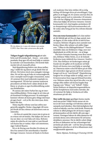 Den som testar kommandot Let’s chat märker att det faktiskt går att föra ett slags samtal, men att dagens AI inte räcker till för en helt fri konversation. Roboten vill gärna styra samtalet mot böcker, filmer eller nyheter och ställer frågor som: ”Vilken är din älsklingsförfattare?” Svaren innehåller data om författaren i fråga, men mer djuplodande än så blir det inte – än så länge. Det krävs fortsatta framsteg inom flera områden, förklarar Nikko Ström, en av de ledande forskarna inom talteknik hos Amazon i Seattle i USA. Han förklarar att forskningen måste gå framåt när det gäller att få maskiner att både förstå och kunna svara med hjälp av naturligt tal. Datorerna måste också bli bättre på att tolka det människor säger genom att förstå sammanhanget och ha ett ”sunt förnuft”. Djupinlärning fungerar bra så länge målet är tydligt, men i en fri konversation finns inga på förhand korrekta svar. Roboten måste lära sig att leta efter svar på många olika ställen och kunna koppla ihop begrepp som ”Zlatan ” och ”fotboll”. Nikko Ström förklarar att djupinlärningsmodellerna därför kompletteras med andra metoder, där AI-systemet får hjälp av forskarna att tolka situationen på rätt sätt. Men varför ska man egentligen kunna snacka med sina prylar? Nikko Ström menar att rösten är det mest naturliga och bekväma sättet att samspela med tekniken. Men bekvämligheten har också en baksida, som har väckt kritik. Röststyrda robotar är alltid påslagna för att kunna reagera på kommandon och hör därför allt som sägs i runmet. Företagen bakom de olika tjänsterna vill använda denna extra information för att kunna skräddarsy annonser. Det är därför också viktigt att föra en diskussion om hur avlyssningen kan användas på andra sätt – och hur den personliga integriteten påverkas av att leva tillsammans med smyglyssnande apparater. Marie Alpman, Forskning & Framsteg (10/18)