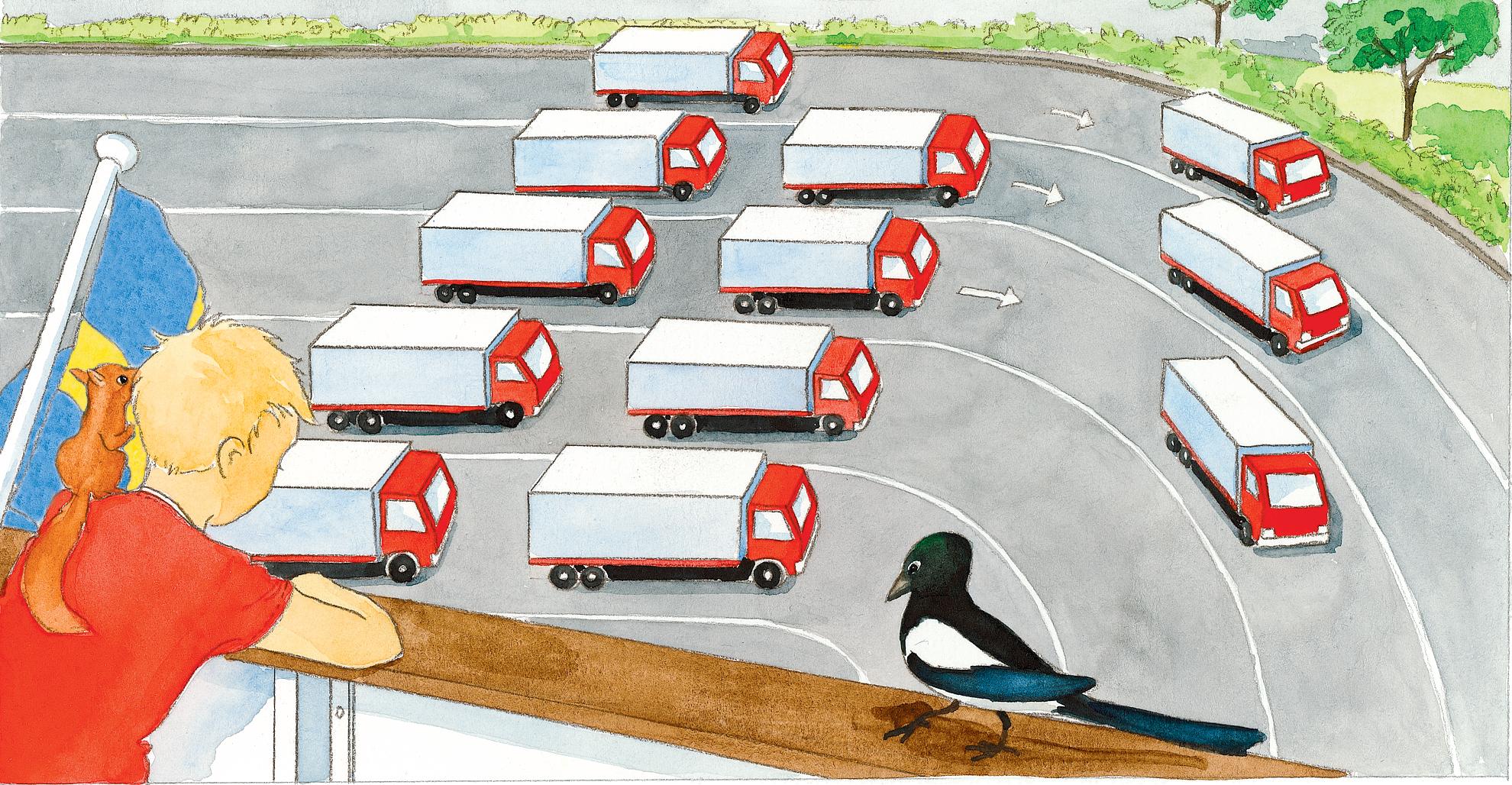 b. På båten finns 14 lastbilar. 5 körs iväg. Hur många lastbilar finns kvar på båten? Svar: