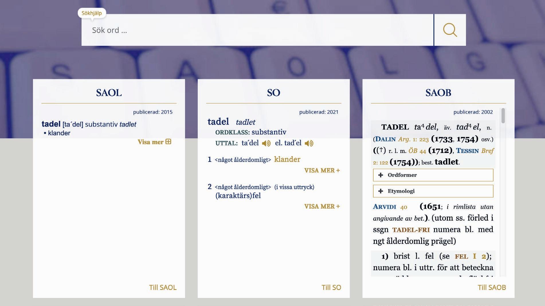 Svenska Akademien ger ut tre ordböcker. Man kan söka i dem samtidigt på svenska.se. Här finns den bästa samlade informationen om orden i svenska språket.