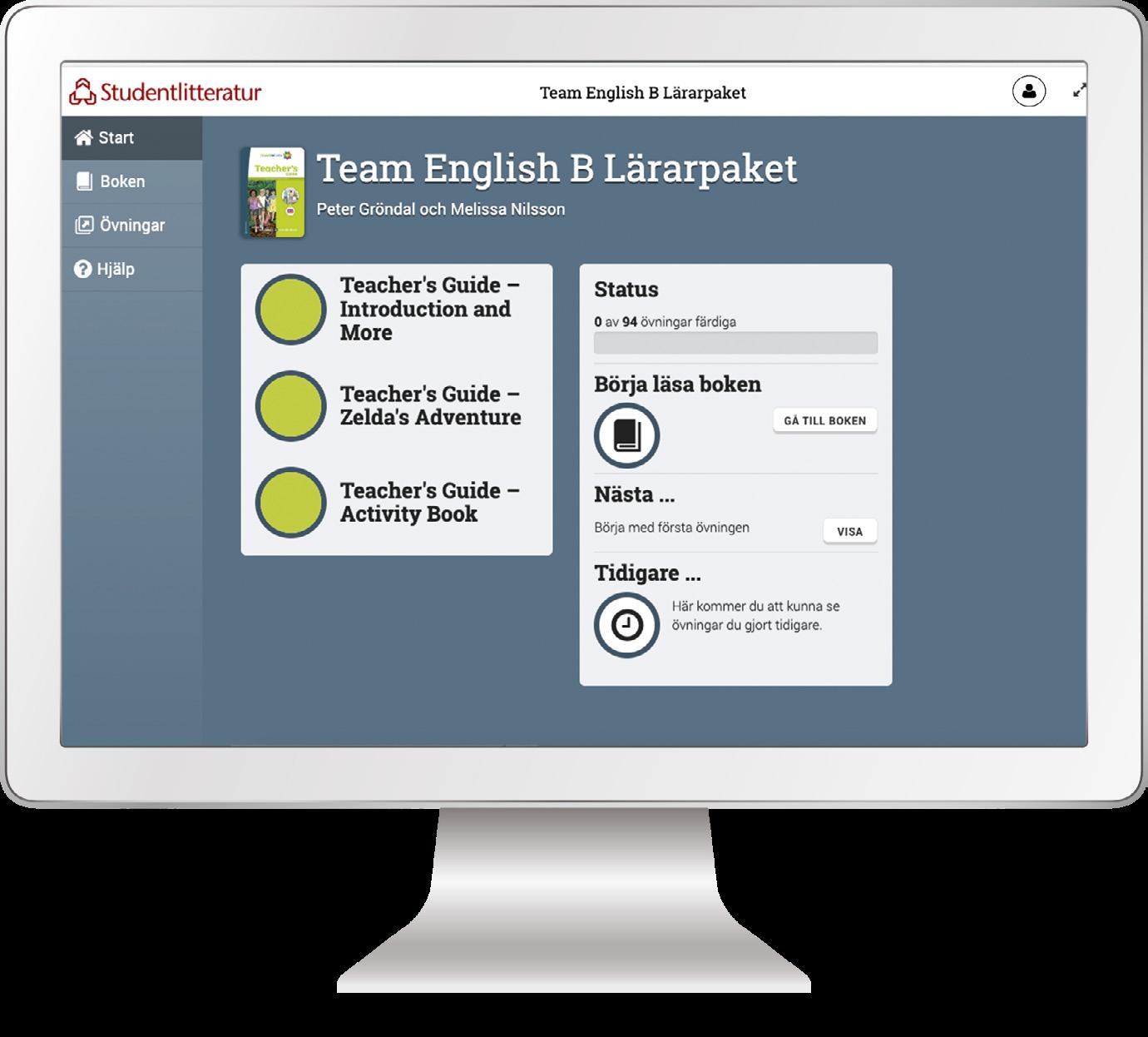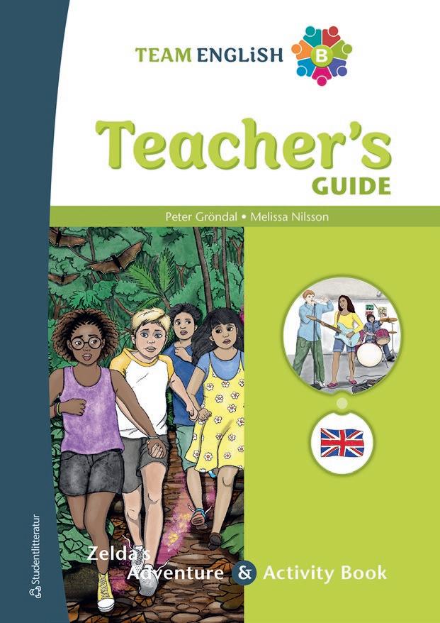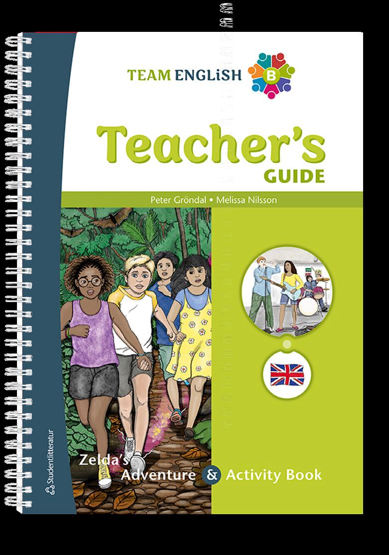Team English B Teacher’s Guide består av en tryckt lärarhandledning och en digital resurs. Lärarpaketet innehåller nödvändiga resurser för arbetet med elevpaketets två böcker; läseboken Zelda’s Adventure och Activity Book B .