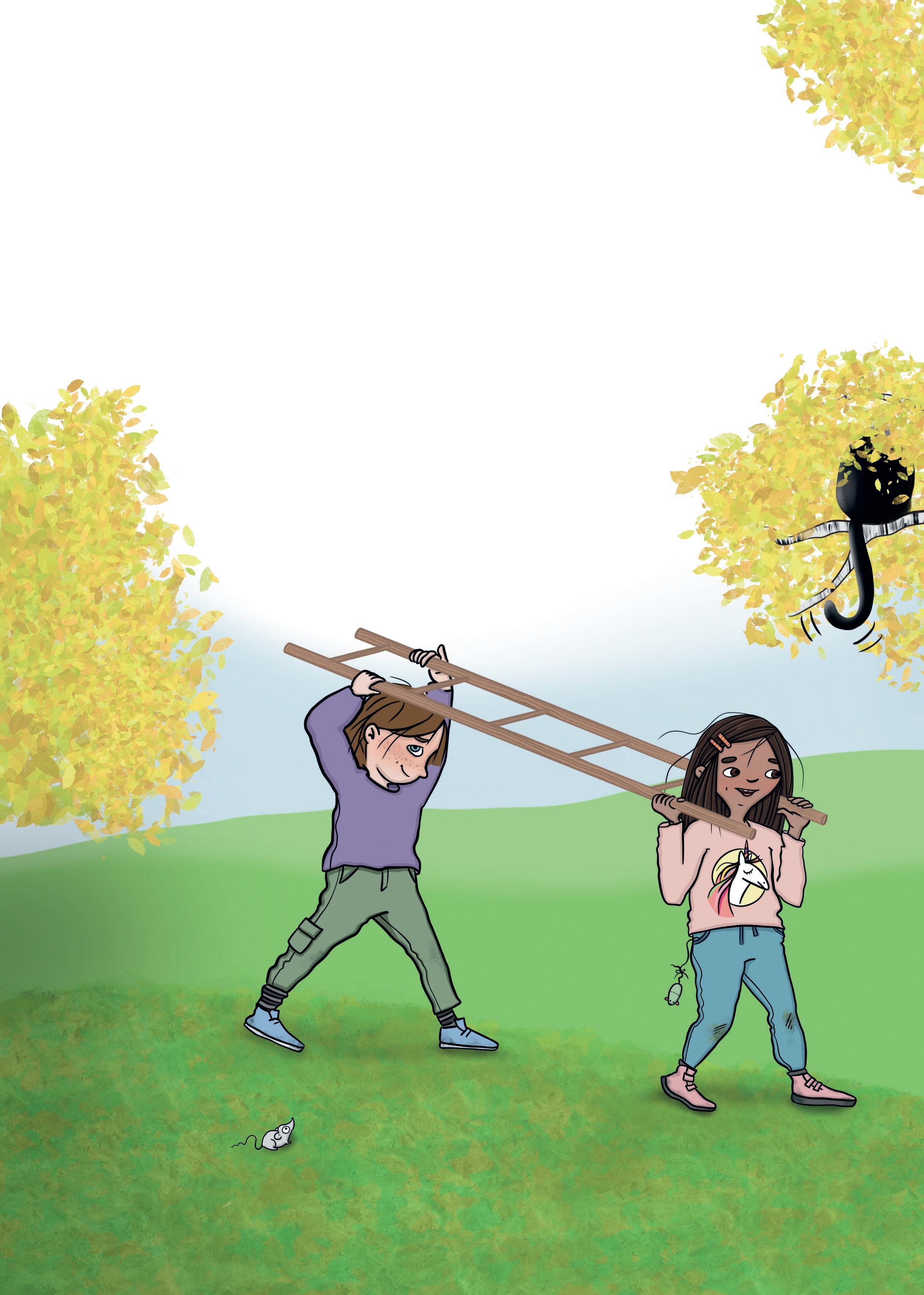 Katten sitter kvar i trÀdet. Den jamar som om den vill ha hjÀlp att komma ner. Otis och Luna reser stegen mot trÀdet.
