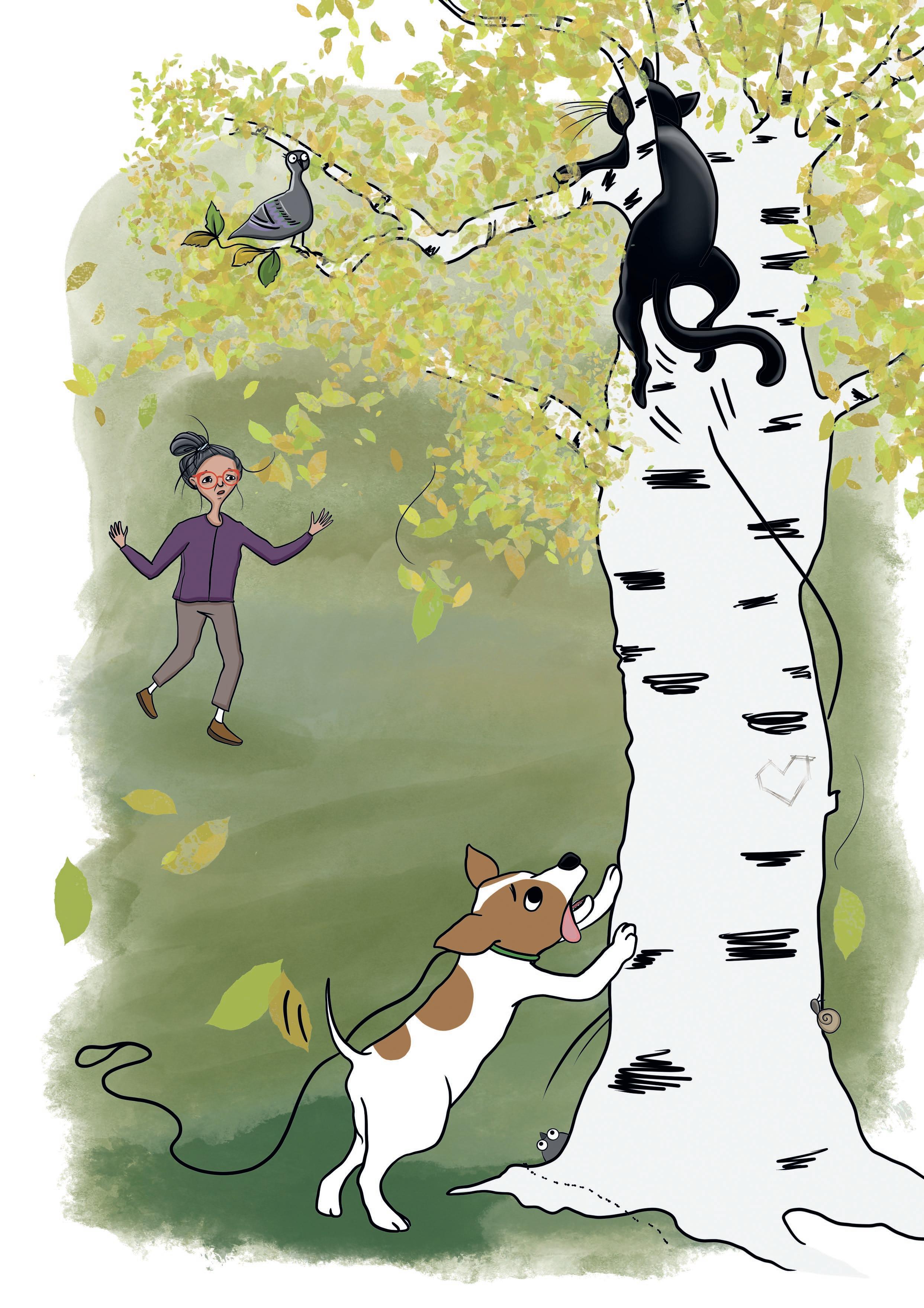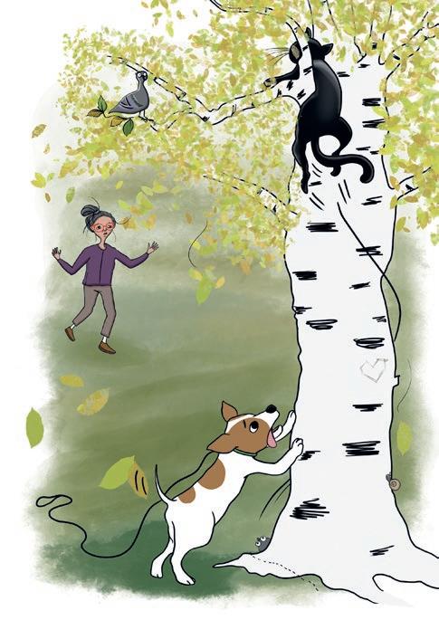 DÄ tar katten sats och springer uppför stammen pÄ ett trÀd. Med sina vassa klor kan den klÀttra vidare högst upp i trÀdet. Hunden Hero stÄr snopet kvar. Han kan inte klÀttra, bara skÀlla lite besviket.