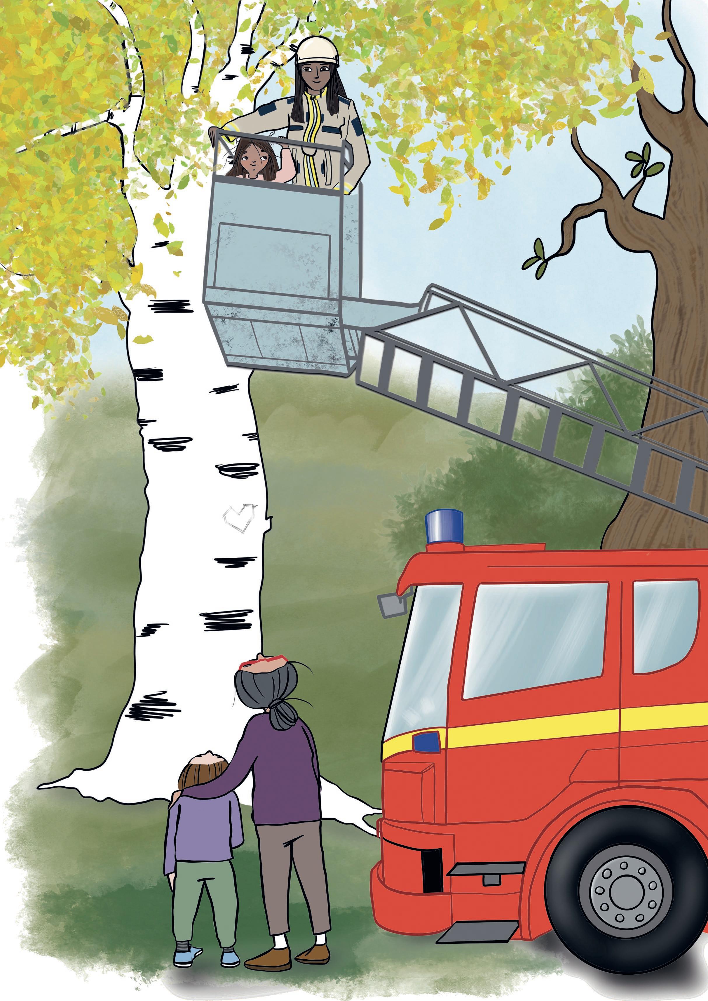 PĂ„ taket pĂ„ den stora bilen finns en stege med en korg. Bilen parkerar nĂ€ra trĂ€det. TvĂ„ brandmĂ€n kliver ut ur förarhytten. De Ă€r klĂ€dda i grĂ„a overaller med gula reflexer. De gĂ„r fram till Maria och presenterar sig. â Vi kommer frĂ„n rĂ€ddningstjĂ€nsten, sĂ€ger den ena brandmannen. Jag heter Frida och det hĂ€r Ă€r min kollega Ludde. Ăr det ni som har ringt?