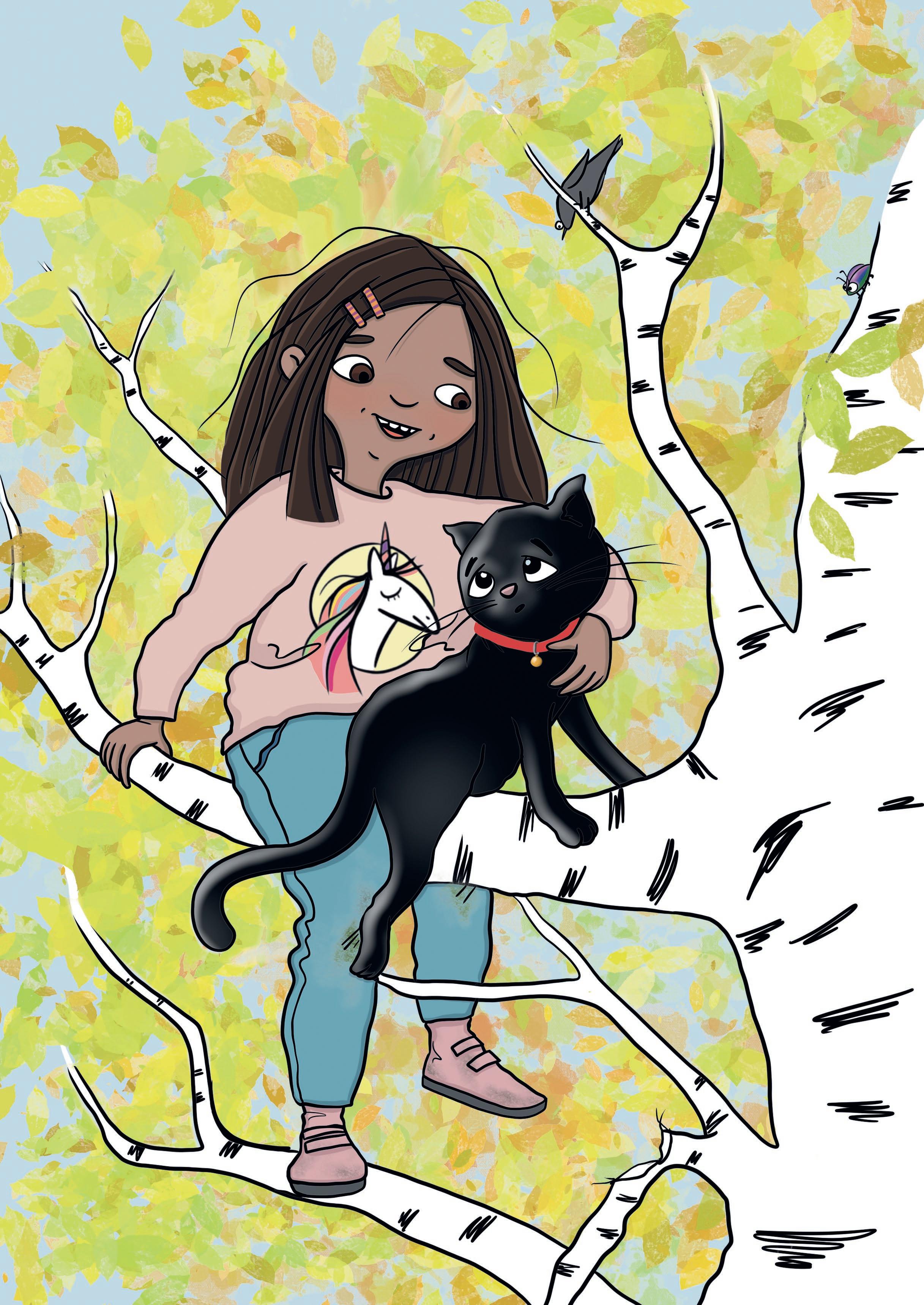 Otis och Luna tittar upp i trÀdet. Högt dÀr uppe sitter den svarta katten. Den sitter helt stilla, som om den Àr rÀdd för att trilla ner.