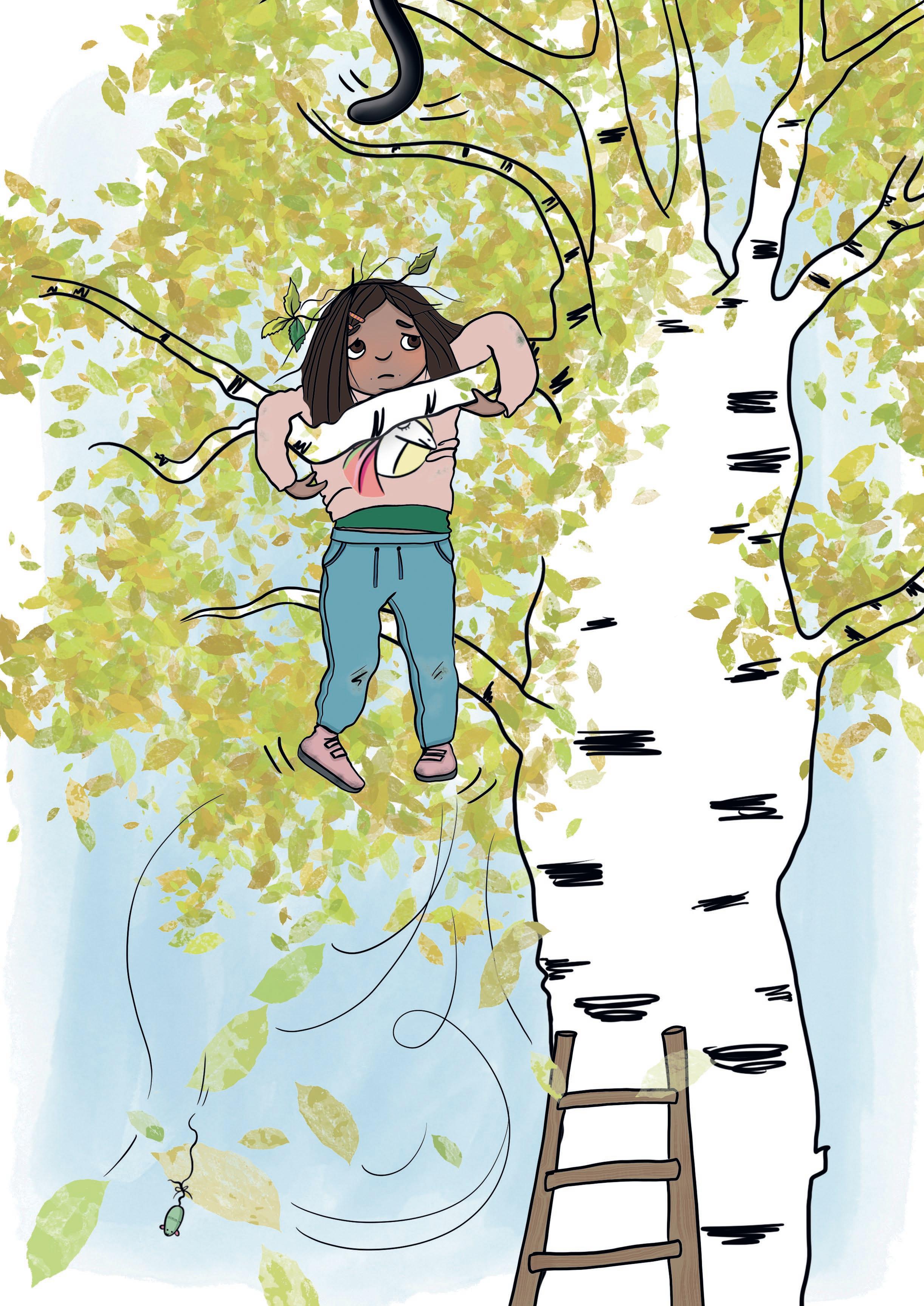 Luna kĂ€nner hur rĂ€dslan griper tag om henne. Hon tittar ner. Det Ă€r jĂ€ttelĂ„ngt ner till marken. Men hon Ă€r duktig pĂ„ att klĂ€ttra. Hon lyckas fĂ„ upp foten pĂ„ en annan gren. Med sina sista krafter drar hon sig upp. Nu sitter hon pĂ„ en gren bredvid katten. Grenen under henne Ă€r knĂ€ckt. â Jag kan inte klĂ€ttra ner, ropar hon.