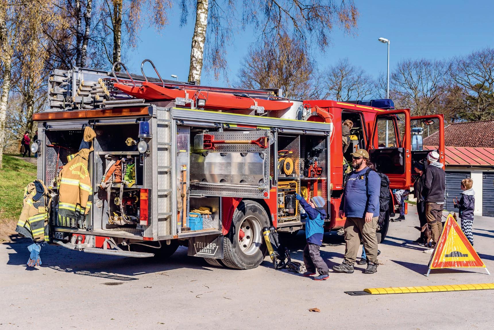 Det tar en stund men sedan kommer en stor röd bil. PĂ„ dörren stĂ„r det âRĂ€ddningstjĂ€nstenâ med gul text.