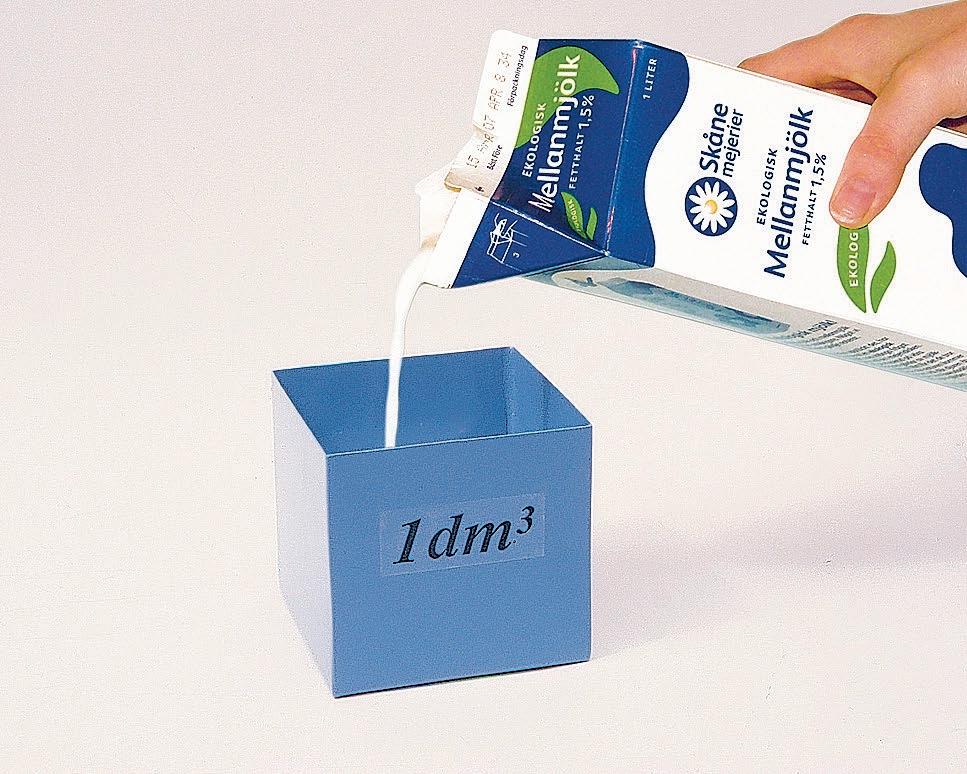En låda som har formen av en kub med kanterna 1dm har volymen 1dm3 (vilket är detsamma som 1liter).